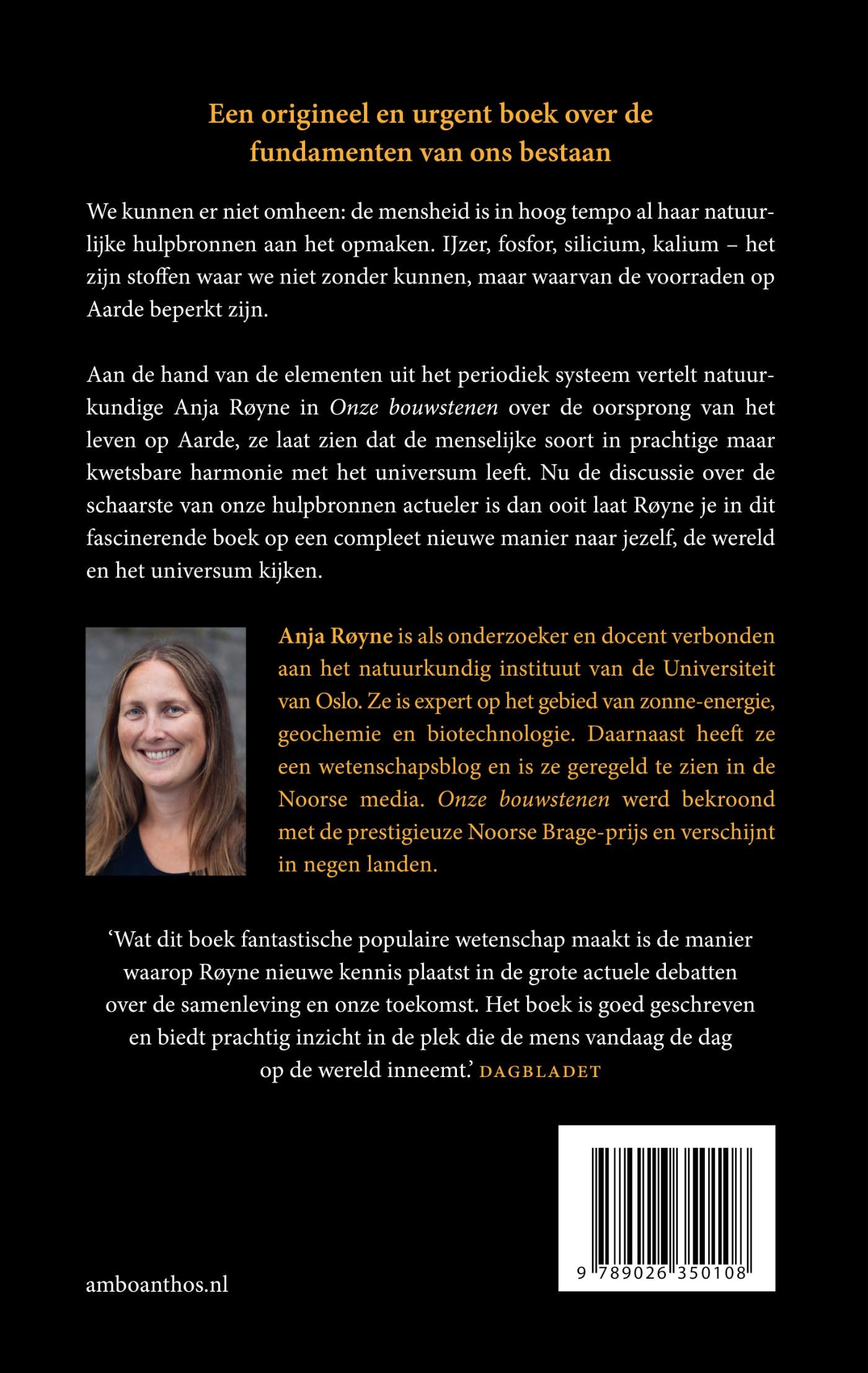 Aan de hand van de elementen uit het periodiek systeem legt Anja Røyne in Onze bouwstenen de oorsprong van het leven op aarde bloot en laat ze zien dat de menselijke soort in een prachtige maar kwetsbare harmonie met het universum leeft. IJzer, fosfor, silicium, kalium – het zijn stoffen waar we niet zonder kunnen, maar de voorraden natuurlijke hulpbronnen waarover de aarde beschikt zijn niet onbeperkt. We moeten er dus spaarzaam mee omgaan.
