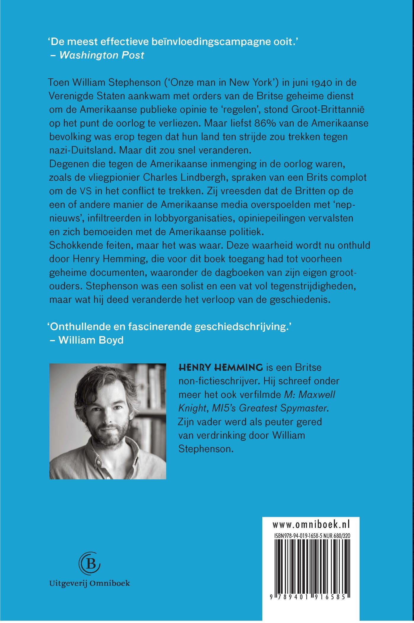 Onze man in New York van Henry Hemming is het waargebeurde historische verhaal van William Stephenson, de man de model stond voor James Bond. Bij het uitbreken van de Tweede Wereldoorlog waren de Verenigde Staten vastbesloten zich niet in de strijd te mengen. In 1940 was 92 procent van de Amerikaanse bevolking tegen inmenging. Churchill echter wist dat hij de oorlog alleen kon winnen met de Amerikanen aan zijn zijde en dus verzon hij een list. De Britse geheime dienst, MI6, stuurde William Stephenson naar New York om daar met behulp van propaganda en nepnieuws de publieke opinie te beïnvloeden. Met succes: anderhalf jaar later vond meer dan tweederde van alle Amerikanen dat het tijd werd dat Amerika zich in de oorlog mengde. Henry Hemming reconstrueert op meesterlijke wijze Stephensons succes. De setting, de afwisselende verhaallijnen en de blijvende inzichten maken Onze man in New York verhalende geschiedenis op zijn best.