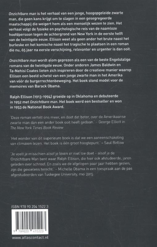 ‘Onzichtbare man’ wordt alom geprezen als een van de beste Engelstalige romans van de twintigste eeuw. Onder anderen James Baldwin en Ta-Nehisi Coates lieten zich inspireren door de creatieve manier waarop Ellison een beeld schetst van een jonge zwarte man in het Amerika van vóór de burgerrechtenbeweging. Het boek stond model voor de memoires van Barack Obama.