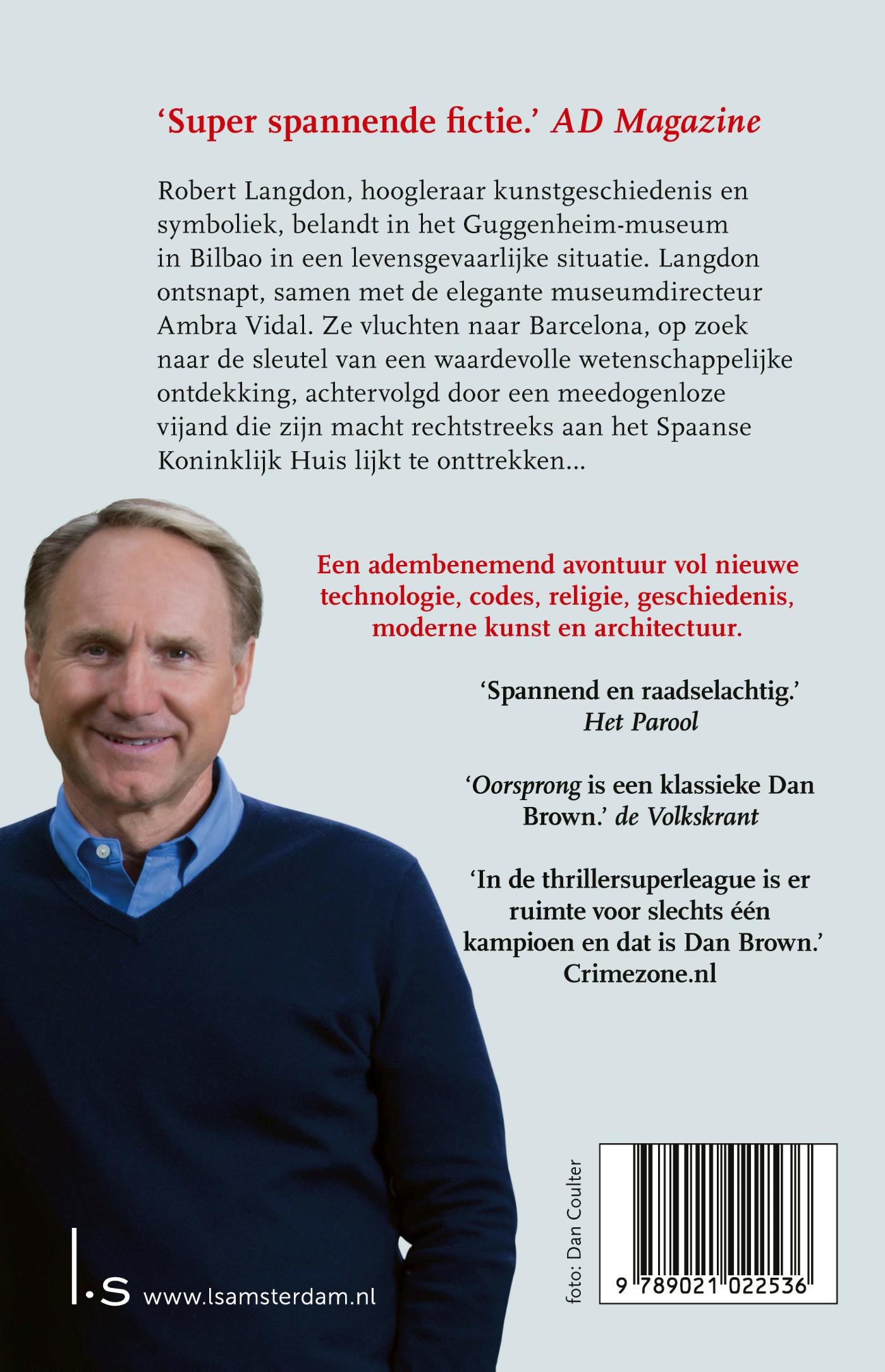 Oorsprong is deel 5 in de Robert Langdon-serie van Dan Brown, de populairste thrillerschrijver ter wereld. Oorsprong speelt zich af in Madrid, Barcelona, Bilbao en Sevilla, zit vol moderne kunst, innovatieve technologie, geschiedenis en architectuur en draait om de belangrijkste vragen ooit: die naar onze herkomst en onze toekomst.