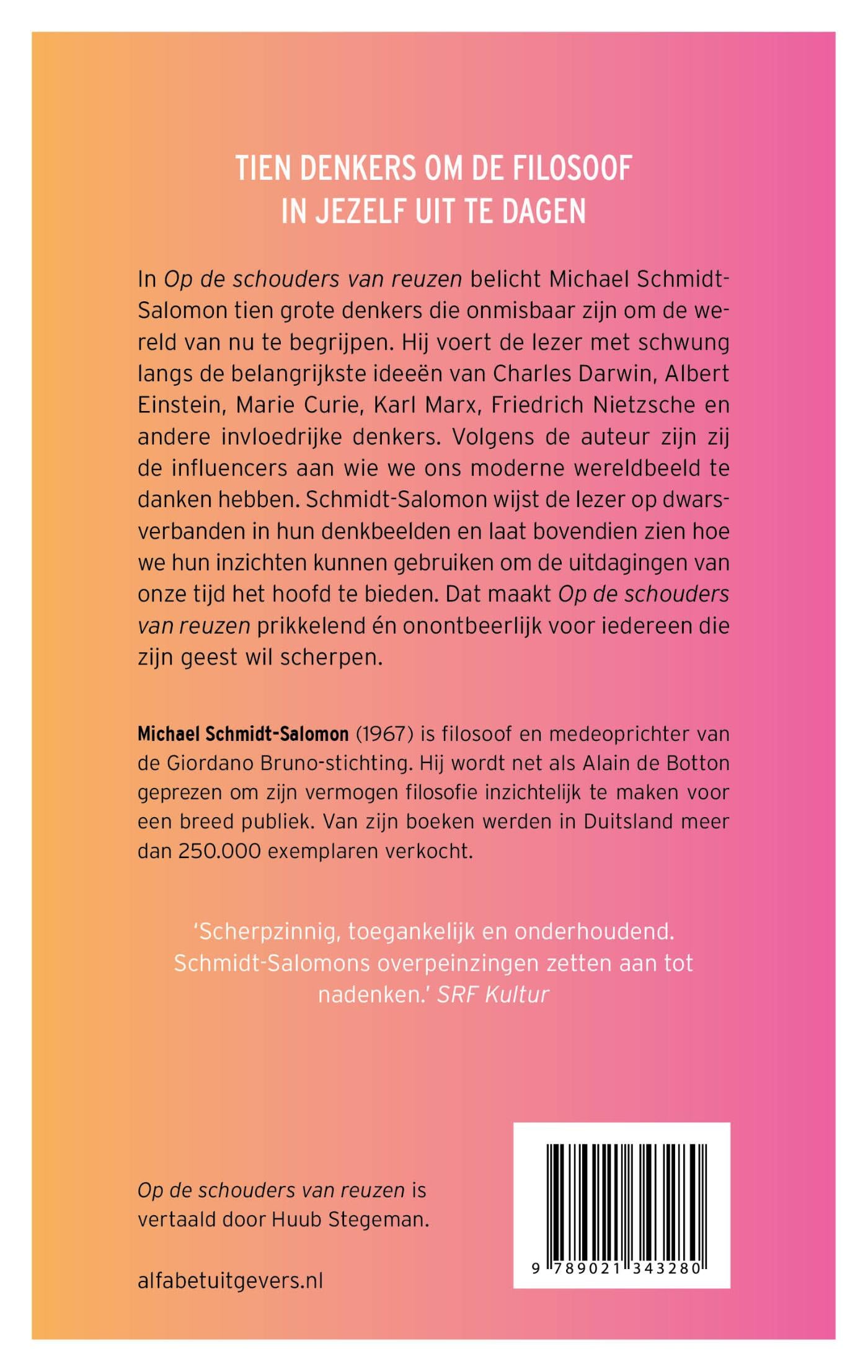 In Op de schouders van reuzen presenteert de Duitse bestsellerauteur Michael Schmidt-Salomon met veel enthousiasme tien grote denkers die onmisbaar zijn om de wereld van nu te begrijpen. Hij voert de lezer mee langs de belangrijkste ideeën van Charles Darwin, Albert Einstein, Marie Curie, Karl Marx, Friedrich Nietzsche en andere belangrijke denkers. Volgens de auteur zijn zij de influencers aan wie we ons moderne wereldbeeld te danken hebben. Schmidt-Salomon wijst de lezer op dwarsverbanden in hun denkbeelden en geeft en passant met veel schwung en gevoel voor anekdotiek hun belangrijkste levensfeiten. Dat maakt Op de schouders van reuzen een feest om te lezen en een ideaal boek voor iedereen die zijn geest wil scherpen.