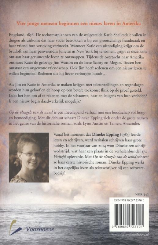 Vier jonge mensen maken de oversteek naar Amerika in 'Op de vleugels van de wind' van Dineke Epping. Engeland, 1856. De toekomstplannen van Katie Shellesdale vallen in duigen als uitkomt dat haar vader betrokken is bij een grootschalige fraudezaak en haar vriend hun verloving verbreekt. Als haar penvriendin Juliette haar uitnodigt voor een bruiloft in New York ziet Katie een kans om aan haar geruïneerde leven te ontsnappen. Tijdens de overtocht naar Amerika raakt Katie bevriend met Jim, Scotty en Megan, die net als zij het verleden willen ontvluchten. De gebeurtenissen aan boord stellen hun geloof en hun hoop voor de toekomst op de proef. Kunnen ze op tijd afrekenen met angst, haat en schaamte? Het romantische verhaal van 'Op de vleugels van de wind' kenmerkt zich door een prachtige boodschap over hoop en bemoediging, waarmee het Dineke Epping zich schaart onder de grote namen in het genre van de historische roman, zoals Lynn Austin en Kim Vogel Sawyer.