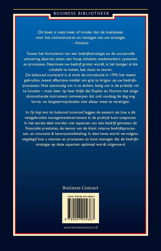 In 'Op kop met de Balanced Scorecard' leggen Robert Kaplan en David Norton duidelijk uit hoe je deze managementvisie kunt opzetten en in de praktijk kunt brengen. Met de Balanced Scorecard worden vier categorieën gemeten: financiële prestaties, kennis van de klant, interne bedrijfsprocessen en innovatie en kennisontwikkeling. Je bedrijf is vervolgens in staat te investeren op de lange termijn - in klanten, in medewerkers, in productontwikkeling en in nieuwe systemen - in plaats van zich te richten op snelle resultaten op de korte termijn.
