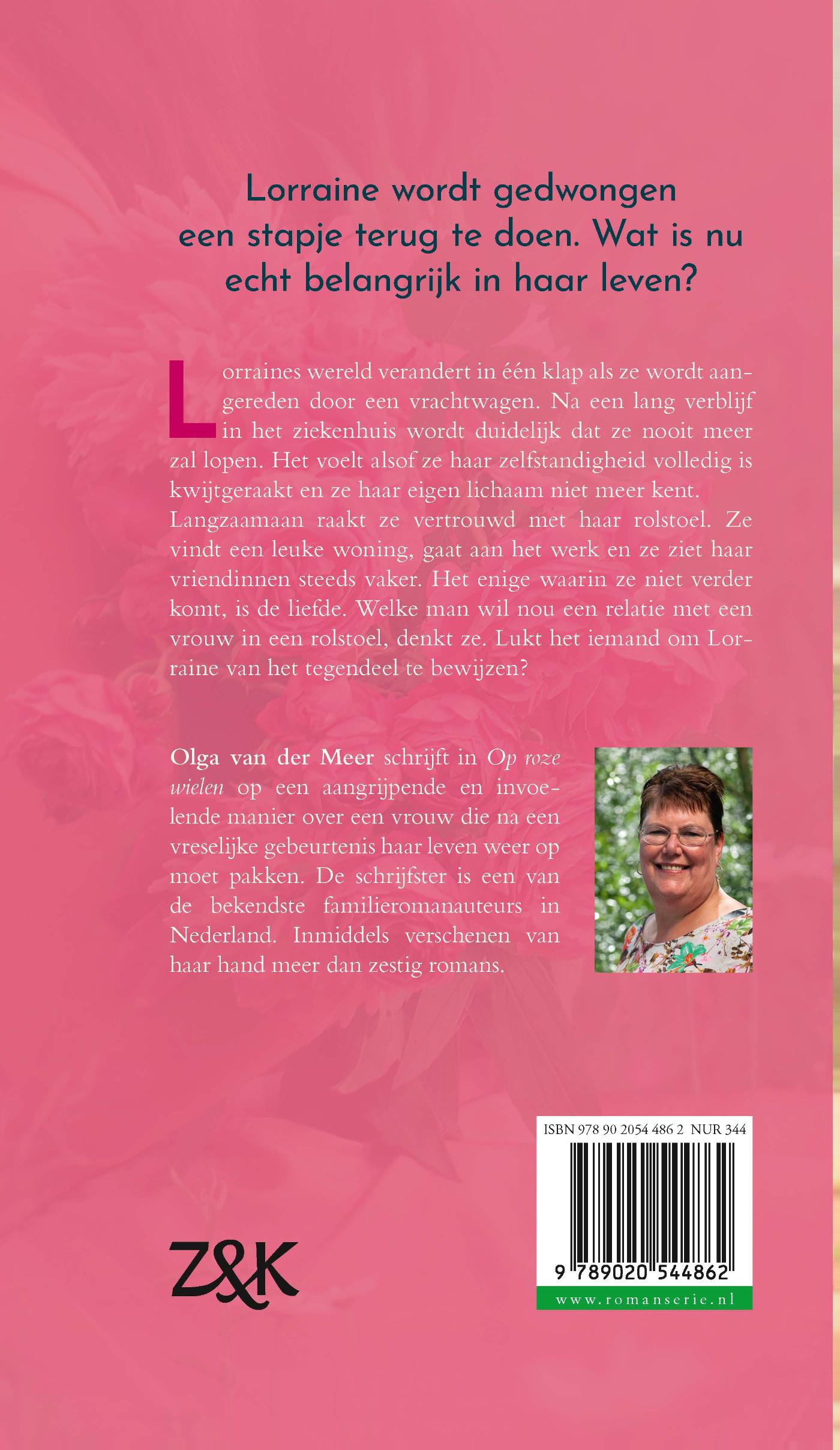 Lorraines leven verandert in één klap als ze wordt aangereden door een vrachtwagen en nooit meer kan lopen. Het voelt alsof ze haar zelfstandigheid volledig is kwijtgeraakt. Langzaam probeert ze haar vertrouwen en plezier in het leven terug te vinden. Het enige gebied waarop ze niet verder komt, is de liefde. Wie wil er immers een vrouw in een rolstoel, denkt ze. Lukt het iemand om haar van het tegendeel te overtuigen? 'Op roze wielen' van Olga van der Meer is een aangrijpende roman over liefde en zelfvertrouwen terugvinden.