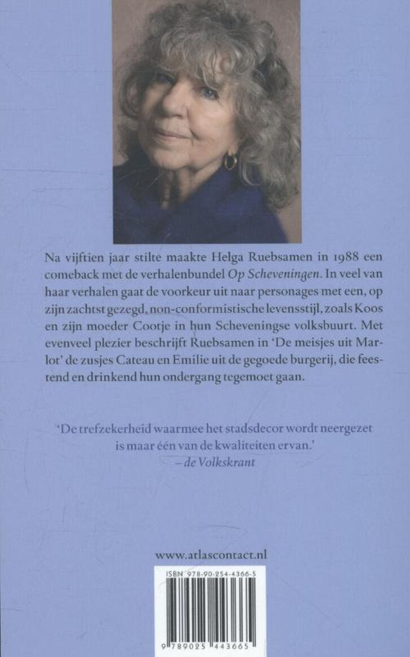 Na vijftien jaar stilte maakte Helga Ruebsamen in 1988 een comeback met de verhalenbundel 'Op Scheveningen'. In veel van haar verhalen gaat de voorkeur uit naar personages met een, op zijn zachtst gezegd, non-conformistische levensstijl, zoals Koos en zijn moeder Cootje in hun Scheveningse volksbuurt. Met evenveel plezier beschrijft Ruebsamen in ‘De meisjes uit Marlot’ de zusjes Cateau en Emilie uit de gegoede burgerij, die feestend en drinkend hun ondergang tegemoet gaan.