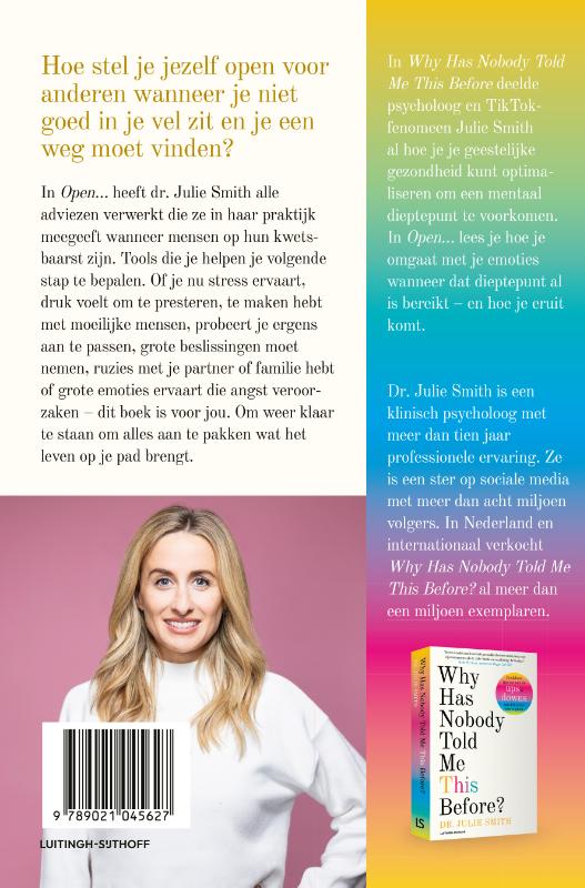 Open… is dé onmisbare aanvulling op Dr. Julie Smiths internationale bestseller Why Has Nobody Told Me This Before? (Waarom heeft niemand mij dit eerder verteld?), waarin ze vaardigheden om je geestelijke gezondheid te versterken uiteenzette.