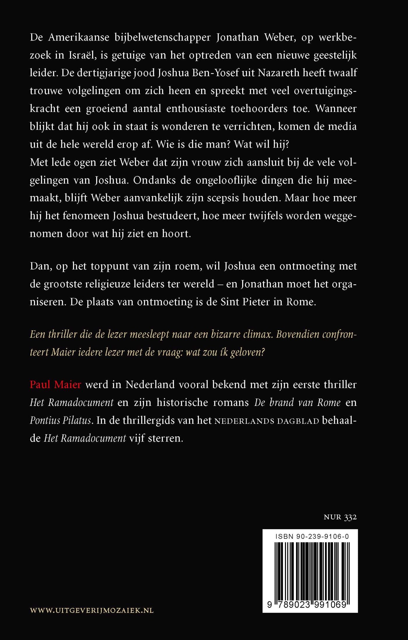 Een thriller die de lezer meesleept naar een bizarre climax. Bovendien confronteert de auteur iedere lezer met de vraag: wat zou ík geloven? Wanneer de Amerikaanse bijbelwetenschapper Jonathan Weber Israël bezoekt, is hij getuige van het optreden van een nieuwe geestelijk leider: Joshua Ben-Yosef. Deze dertigjarige Jood uit Nazareth heeft in korte tijd twaalf volgelingen om zich heen verzameld en spreekt met veel overtuigingskracht enthousiaste menigten toe. Wanneer blijkt dat hij ook in staat is wonderen te verrichten, komen de media uit de hele wereld erop af. Wie is die man? Wat wil hij? Met lede ogen ziet Weber dat zijn vrouw zich aansluit bij de volgelingen van deze Jood uit Nazareth. Ondanks de ongelooflijke dingen die hij ziet en hoort, blijft hij aanvankelijk zijn scepsis houden. Maar hoe meer hij het fenomeen Joshua bestudeert, hoe meer zijn twijfels verdwijnen. Dan, op het toppunt van zijn roem, wil Joshua een ontmoeting met de grootste religieuze leiders ter wereld en Jonathan moet het organiseren. De plaats van ontmoeting is de Sint Pieter in Rome.