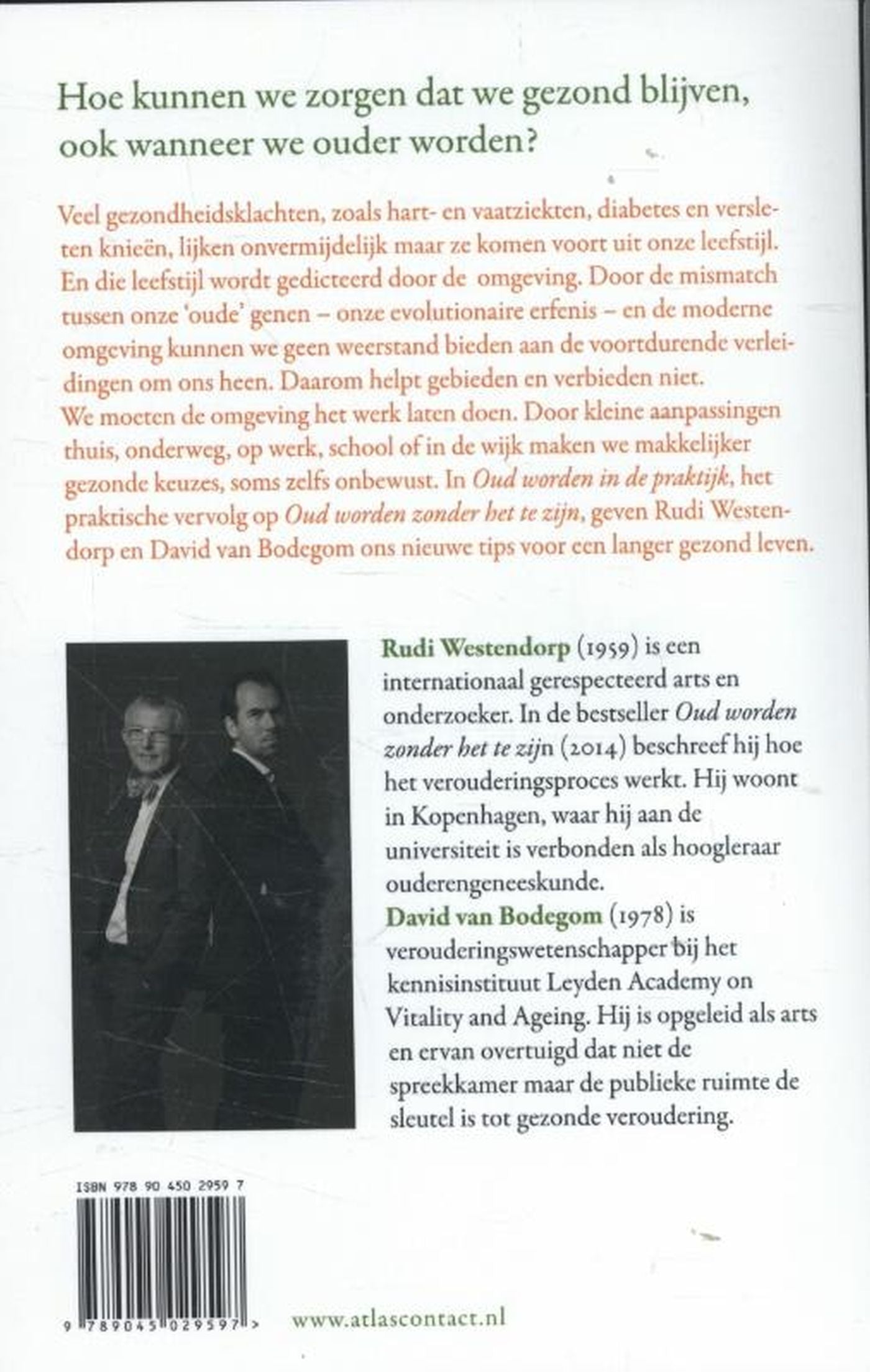 We moeten de omgeving het werk laten doen. Door kleine aanpassingen thuis, onderweg, op werk, school of in de wijk maken we makkelijker gezondere keuzes, soms zelfs onbewust. In Oud worden in de praktijk, het praktische vervolg op Oud worden zonder het te zijn, geven Rudi Westendorp en David van Bodegom ons nieuwe tips voor een langer gezond leven.