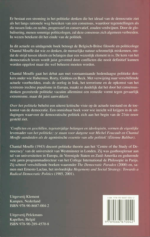 Chantal Mouffe gaat het debat aan met vooraanstaande hedendaagse politieke den - kers onder wie Habermas, Rorty, Giddens en Beck. Met verwijzing naar verschillende actuele voorbeelden, zoals de oorlog in Irak, het terrorisme en de opkomst van het (ex treem-)rechtse populisme in Europa, maakt ze duidelijk dat het door het consensusdenken gecreëerde politieke vacuüm allerminst een remedie vormt tegen gevaarlijk extremisme, maar dit juist aanwakkert.