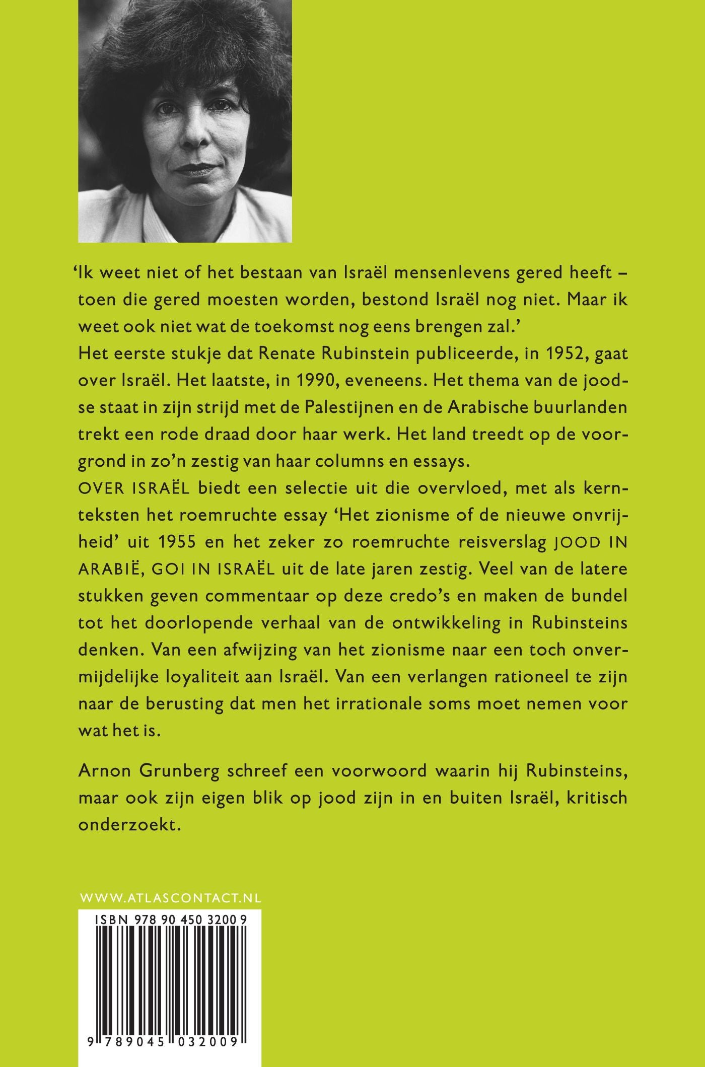 Over Israël biedt een selectie uit die overvloed, met als kern het roemruchte essay ‘Het zionisme of de nieuwe onvrijheid’ uit 1955 en het zeker zo roemruchte reisverslag 'Jood in Arabië', Goi in Israël' uit de late jaren zestig. Veel van haar latere stukken geven commentaar op deze credo’s en maken dit boek tot het doorlopende verhaal van de ontwikkeling in Rubinsteins denken. Van een afwijzing van het zionisme naar een toch onvermijdelijke loyaliteit aan Israël. Van een verlangen rationeel te zijn naar de berusting dat men het irrationale soms moet nemen voor wat het is