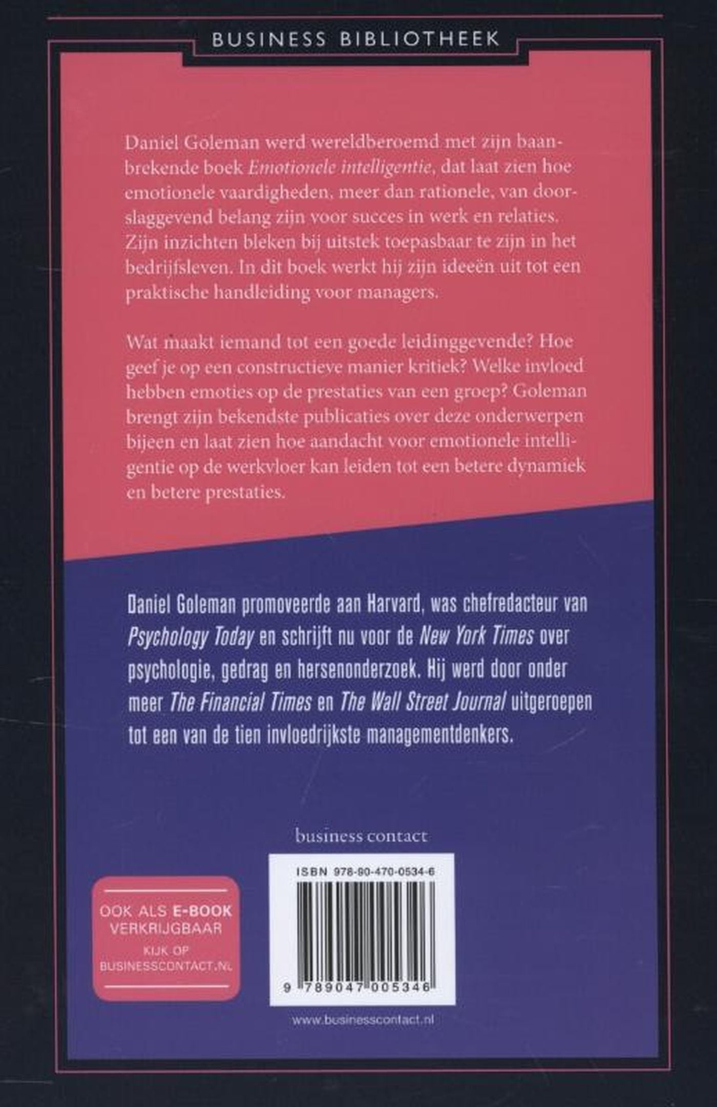 Daniel Goleman werd wereldberoemd met zijn baanbrekende boek Emotionele intelligentie, dat laat zien hoe emotionele vaardigheden, meer dan rationele, van doorslaggevend belang zijn voor succes in werk en relaties. Zijn inzichten bleken bij uitstek toepasbaar te zijn in het bedrijfsleven. In dit boek werkt hij zijn ideeën uit tot een praktische handleiding voor managers. Wat maakt iemand tot een goede leidinggevende? Hoe geef je op een constructieve manier kritiek? Welke invloed hebben emoties op de prestaties van een groep? Goleman brengt zijn bekendste publicaties over deze onderwerpen bijeen en laat zien hoe aandacht voor emotionele intelligentie op de werkvloer kan leiden tot een betere dynamiek en betere prestaties.