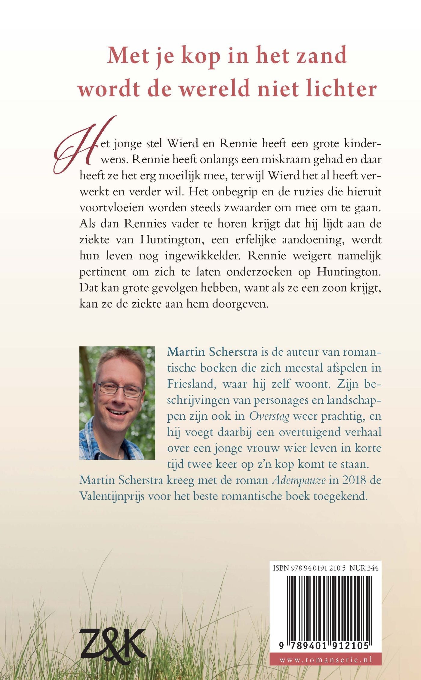 Het jonge koppel Wierd en Rennie heeft een grote kinderwens, in 'Overstag' van Martin Scherstra. Rennie heeft onlangs een miskraam gehad en daar heeft ze het erg moeilijk mee, terwijl Wierd het verlies al heeft verwerkt en verder wil. Het wederzijdse onbegrip en de ruzies die hieruit voortvloeien worden steeds moeilijker om mee om te gaan. Als dan Rennies vader te horen krijgt dat hij de ziekte van Huntington heeft, een erfelijke ziekte, wordt hun leven nog ingewikkelder. Rennie weigert namelijk pertinent zich te laten onderzoeken op de ziekte. Martin Scherstra brengt met 'Overstag' een overtuigende familieroman over moeilijke keuzes, die je niet voor altijd voor je uit kunt blijven schuiven.