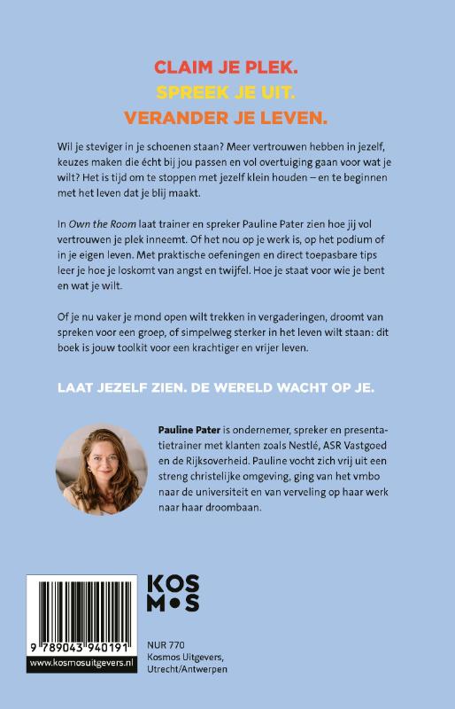 Zeg vaarwel tegen twijfels, pak angsten bij de lurven en laat jezelf zien. Met Own the Room leert de lezer zijn of haar plek in te nemen op het werk, op het podium, en in zijn eigen leven. Het praktische boek van trainer en spreker Pauline Pater staat vol herkenbare verhalen, oefeningen en toepasbare tips. Pauline Pater geeft iedereen het zelfvertrouwen om te kiezen voor wat hij echt wil en zich niet langer te laten afleiden door de meningen van anderen.