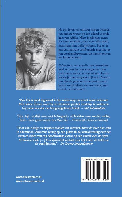 Na een leven vol omzwervingen belandt een oudere vrouw op een eiland voor de kust van Afrika. Niets bindt haar meer. Ze zoekt sensaties, staat voor alles open, maar haar hart blijft gesloten. Tot ze, in een dramatische confrontatie met het lot van de eilandbewoners, de intensiteit van het leven hervindt. Palmwijn is een novelle over betrokkenheid en over het onvermogen iets aan andermans misère te veranderen. In zijn beeldrijke en energieke stijl weet Adriaan van Dis als geen ander de zwakte en de kracht te schilderen van een mens, een eiland, een continent.
