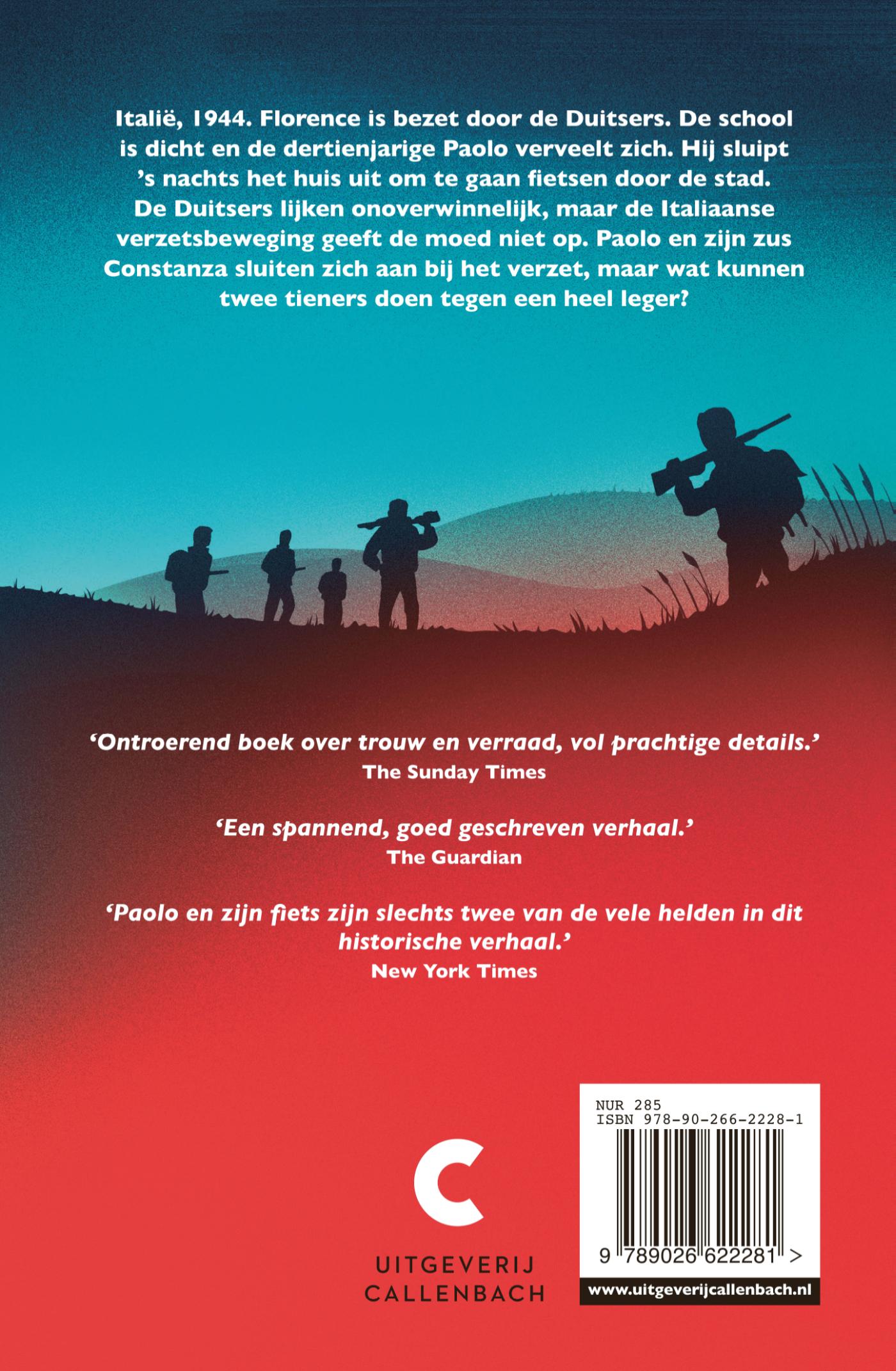 ‘Paolo’s oorlog’ is een spannend en aangrijpend oorlogsverhaal. Het is 1944 en de dertienjarige Paolo woont in Florence, dat is bezet door de Duitsers. Maar het Italiaanse verzet heeft de hoop nog niet opgegeven, en Paolo doet dat ook niet. Zeker niet wanneer hij de kans krijgt om twee verzetsstrijders te helpen. Maar wat kan één jongen op de fiets beginnen tegen een heel leger?