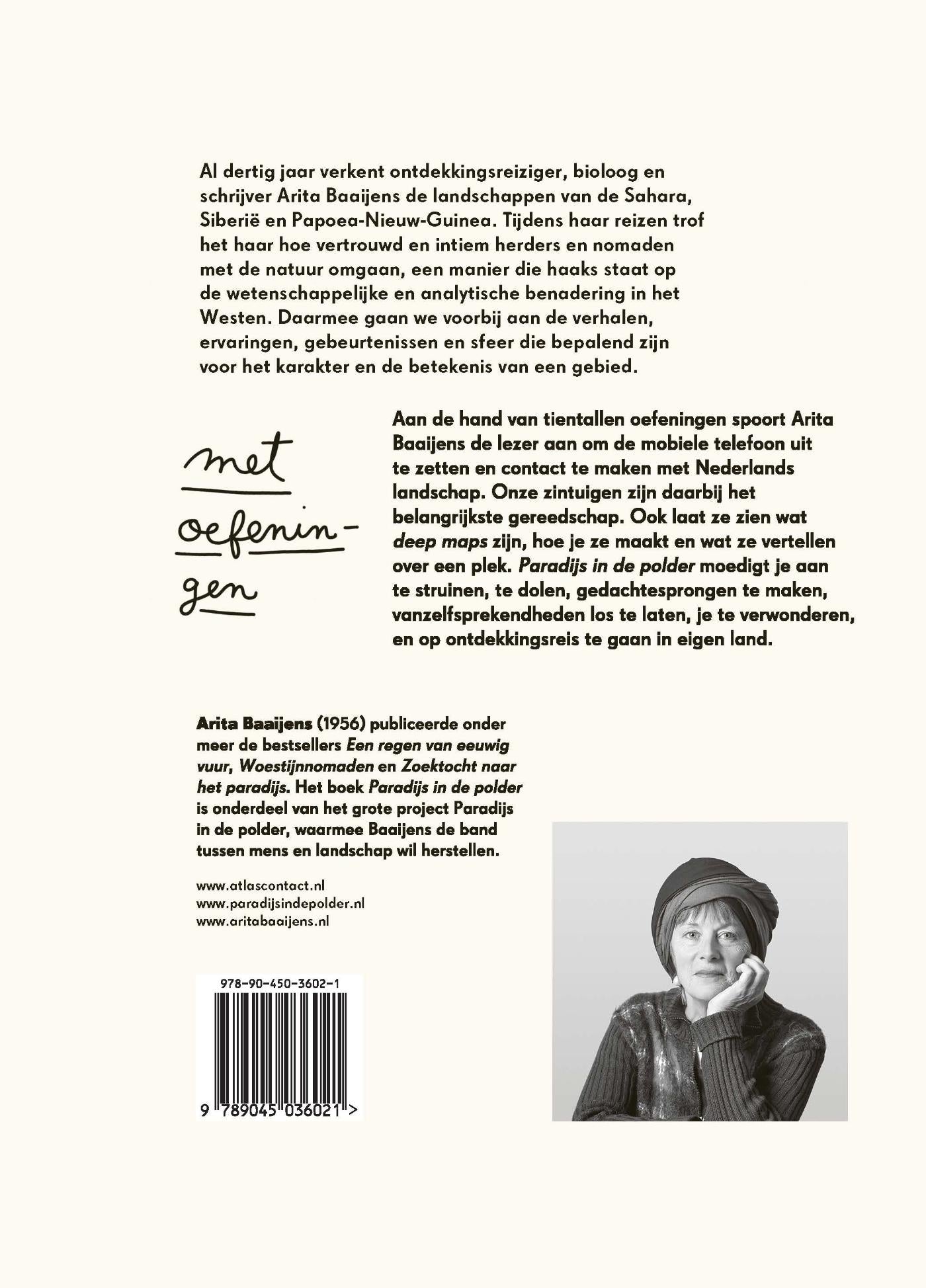Al dertig jaar verkent ontdekkingsreiziger, bioloog en schrijver Arita Baaijens de landschappen van de Sahara, Siberië en Papoea-Nieuw-Guinea. Tijdens haar reizen trof het haar hoe vertrouwd en intiem herders en nomaden met de natuur omgaan, een manier die haaks staat op de wetenschappelijke en analytische benadering in het Westen. In Paradijs in de polder wijst ze erop hoezeer kaartenmakers bepalen hoe wij het landschap zien en ervaren. Wat niet op de kaart staat, bestaat officieel niet. Daarmee gaan we voorbij aan de verhalen, ervaringen, gebeurtenissen en sfeer die bepalend zijn voor het karakter en de betekenis van een gebied.