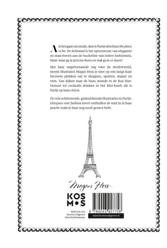 Parijs is het summum van stijl, het epicentrum van elegantie, één van de grote modesteden ter wereld. Met haar ongeëvenaarde mode-oog neemt de internationaal geprezen illustrator en bestsellerauteur Megan Hess je mee op een persoonlijke tour langs alle Parijse hotspots. In ‘Parijs’ vind je de beste plekken om te eten, te shoppen, te ontspannen en te overnachten. Van mensen kijken in de Rue Saint-Honoré tot cocktails drinken in het Ritz, dit is Parijs op zijn chicst.