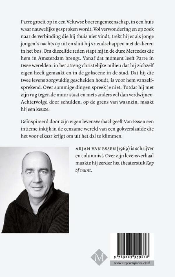 Parre groeit op in een Veluwse boerengemeenschap, in een huis waar nauwelijks gesproken wordt. Vol verwondering en op zoek naar de verbinding die hij thuis niet vindt, trekt hij er als jonge jongen ’s nachts op uit en sluit hij vriendschappen met de dieren in het bos. Om diezelfde reden stapt hij in de dure Mercedes die hem in Amsterdam brengt. Vanaf dat moment leeft Parre in twee werelden: in het streng christelijke milieu dat hij zichzelf eigen heeft gemaakt en in de gokscene in de stad. Dat hij die twee levens zorgvuldig gescheiden houdt, is voor hem vanzelfsprekend. Over sommige dingen spreek je niet. Totdat hij met zijn rug tegen de muur staat en niets anders wil dan verdwijnen. Achtervolgd door schulden, op de grens van waanzin, maakt hij een keuze.