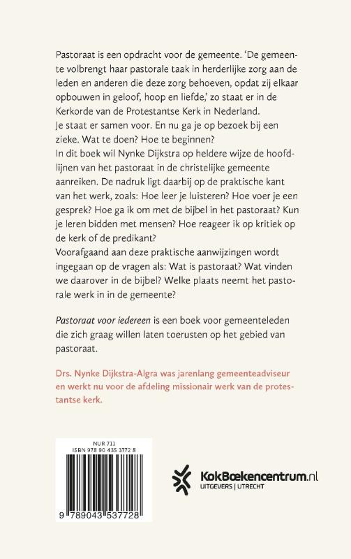 In dit boek wil Nynke Dijkstra in een kort bestek, op heldere wijze de hoofdlijnen van het pastoraat in de christelijke gemeente aanreiken. De nadruk ligt daarbij op de praktische kant van het werk: hoe leer je luisteren? Hoe voer je een gesprek? Hoe ga ik om met de bijbel in het pastoraat? Kun je leren bidden met mensen? Hoe reageer ik op kritiek op de kerk of de predikant? Hoe leer ik mijn beperkingen en mijn kracht kennen? Voorafgaand aan deze praktische aanwijzingen wordt ingegaan op de vragen: Wat is pastoraat? Wat vinden we daarover in de Bijbel? Welke plaats neemt het pastorale werk in in de gemeente? Wat mogen we daarin van elkaar verwachten?