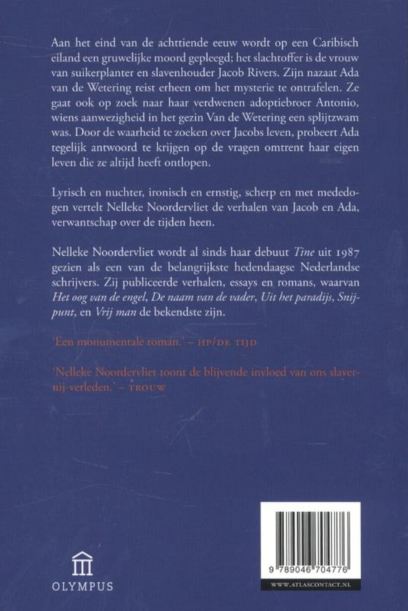 Aan het eind van de achttiende eeuw wordt op een Caribisch eiland een gruwelijke moord gepleegd; het slachtoffer is de vrouw van suikerplanter en slavenhouder Jacob Rivers. Zijn nazaat Ada van de Wetering reist erheen om het mysterie te ontrafelen. Ze gaat ook op zoek naar haar verdwenen adoptiebroer Antonio, wiens aanwezigheid in het gezin Van de Wetering een splijtzwam was. Door de waarheid te zoeken over Jacobs leven, probeert Ada tegelijk antwoord te krijgen op de vragen omtrent haar eigen leven die ze altijd heeft ontlopen. Lyrisch en nuchter, ironisch en ernstig, scherp en met mededogen vertelt Nelleke Noordervliet de verhalen van Jacob en Ada, verwantschap over de tijden heen.