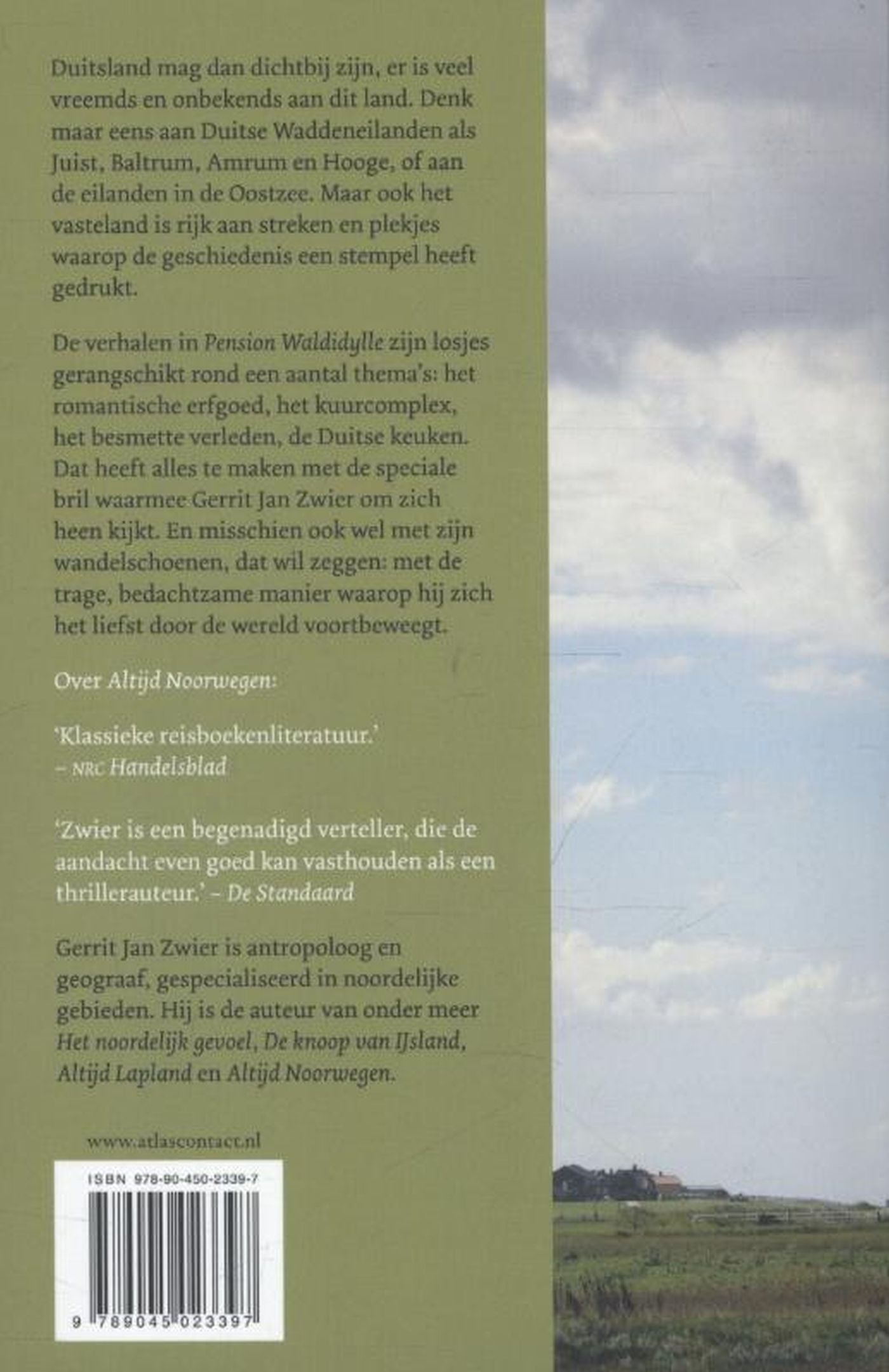 De verhalen in Pension Waldidylle zijn losjes gerangschikt rond een aantal thema s: het romantische erfgoed, het `kuurcomplex , het `besmette verleden, de Duitse keuken. Dat heeft alles te maken met de speciale bril waarmee Gerrit Jan Zwier om zich heen kijkt. En misschien ook wel met zijn wandelschoenen, dat wil zeggen: met de trage, bedachtzame manier waarop hij zich het liefst door de wereld voortbeweegt.