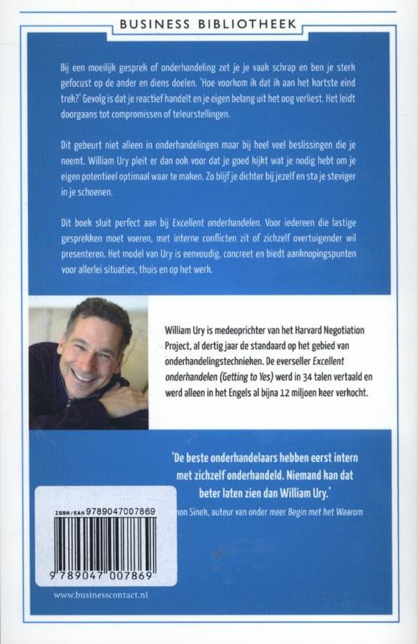 Dit boek is een essentiële voorbereiding op Excellent onderhandelen. Voor iedereen die lastige gesprekken moet voeren, met interne conflicten zit of zichzelf overtuigender wil presenteren. Het model van Ury is eenvoudig, concreet en biedt aanknopingspunten voor allerlei situaties, thuis en op het werk.