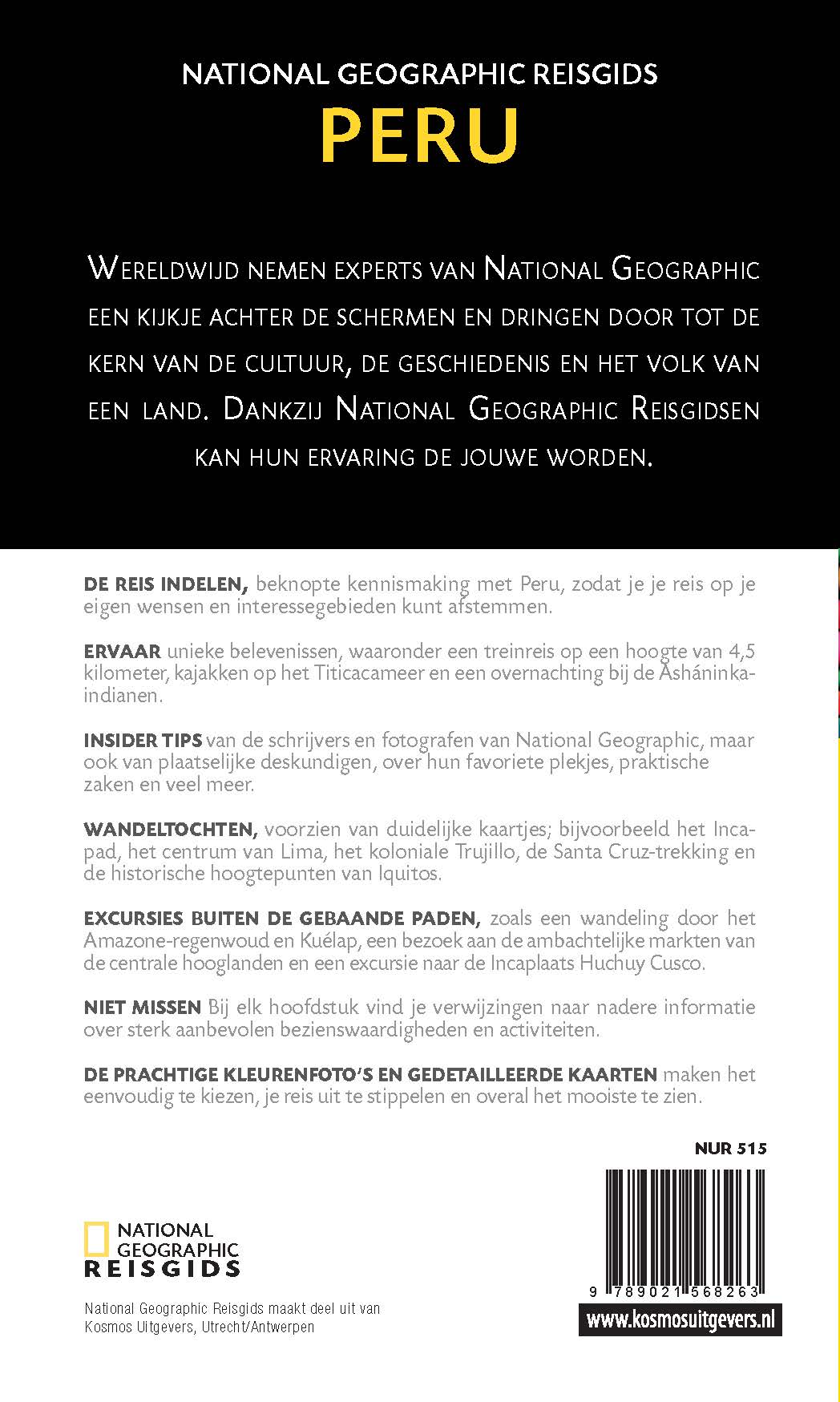 National Geographic Reisgids Peru is een exclusieve gids met sublieme fotografie die u meeneemt naar de bekende en minder bekende bezienswaardigheden. De experts van National Geographic nemen een kijkje achter de schermen en dringen door tot de kern van de cultuur, de geschiedenis en het volk van het land.