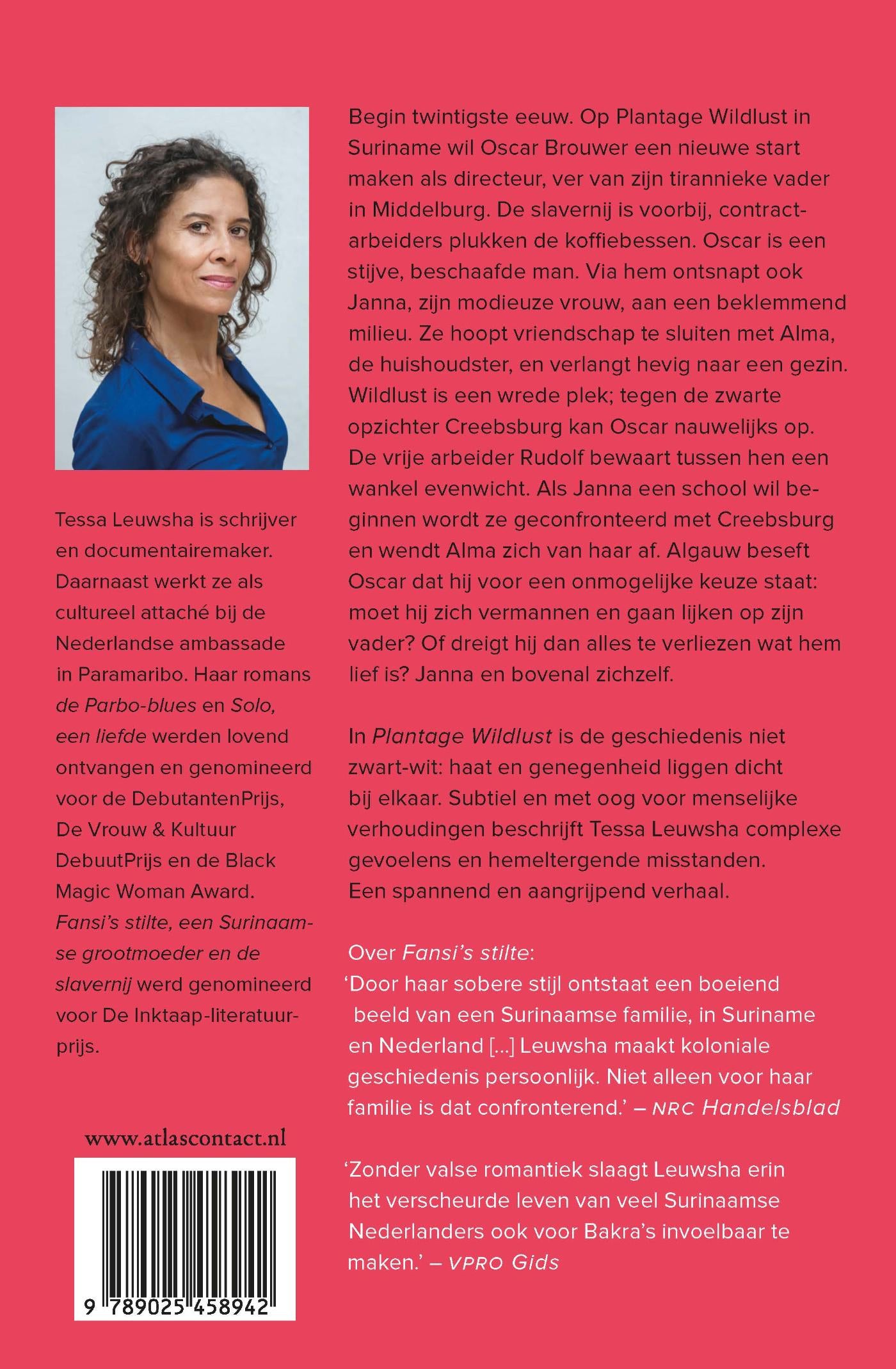 ‘Plantage Wildlust’ van Tessa Leuwsha brengt ons naar begin twintigste eeuw. Op Plantage Wildlust in Suriname wil Oscar Brouwer een nieuwe start maken als directeur, ver van zijn tirannieke vader in Middelburg. De slavernij is voorbij, contractarbeiders plukken de koffiebessen. Oscar is een stijve, beschaafde man. Via hem ontsnapt ook Janna, zijn modieuze vrouw, aan een beklemmend milieu. Ze hoopt vriendschap te sluiten met Alma, de huishoudster, en verlangt hevig naar een gezin. Wildlust is een wrede plek; tegen de zwarte opzichter Creebsburg kan Oscar nauwelijks op. De vrije arbeider Rudolf bewaart tussen hen een wankel evenwicht. Als Janna een school wil beginnen wordt ze geconfronteerd met Creebsburg en wendt Alma zich van haar af. Algauw beseft Oscar dat hij voor een onmogelijke keuze staat: moet hij zich vermannen en gaan lijken op zijn vader? Of dreigt hij dan alles te verliezen wat hem lief is? Janna en bovenal zichzelf.