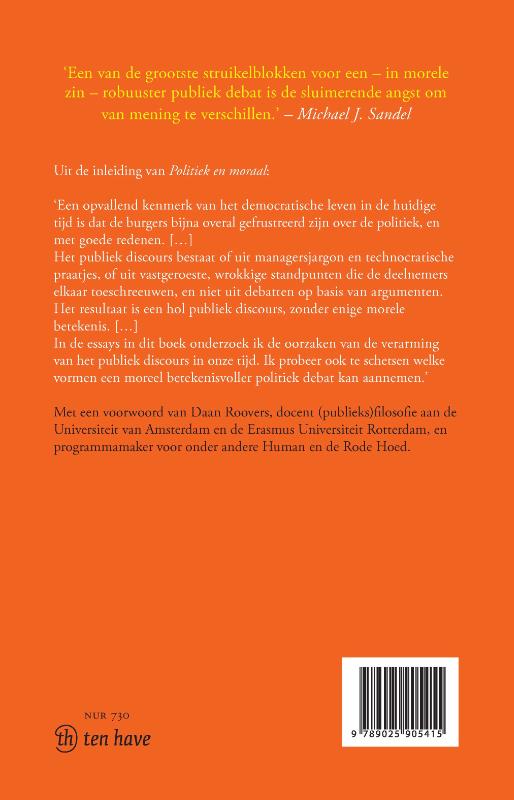 'Politiek en moraal'van Harvard filosoof Michael Sandel (bekend van o.a. optreden met Joris Luyendijk en Bas Heijne) behandelt de vraag of politiek, wetgeving en rechtspraak waardevrij kunnen zijn. Het bevat nooit eerder vertaalde artikelen over o.a. burgerschap, economie, liberalisme en positieve discriminatie. Het eerste essay is de hartstochtelijke toespraak 'De verleerde kunst van het democratisch debat', die Sandel hield in 2014 toen de Universiteit Utrecht hem een eredoctoraat verleende.