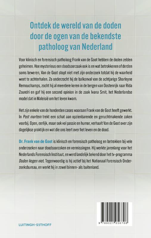 Het zijn enkele van de honderden cases waaraan Frank van de Goot heeft gewerkt. In Post mortem trekt een schat aan opzienbarende en geruchtmakende zaken voorbij. Open, eerlijk, maar ook vol passie en humor, verhaalt Van de Goot over zijn dagelijkse praktijk en wat die ons leert over het leven en de dood.