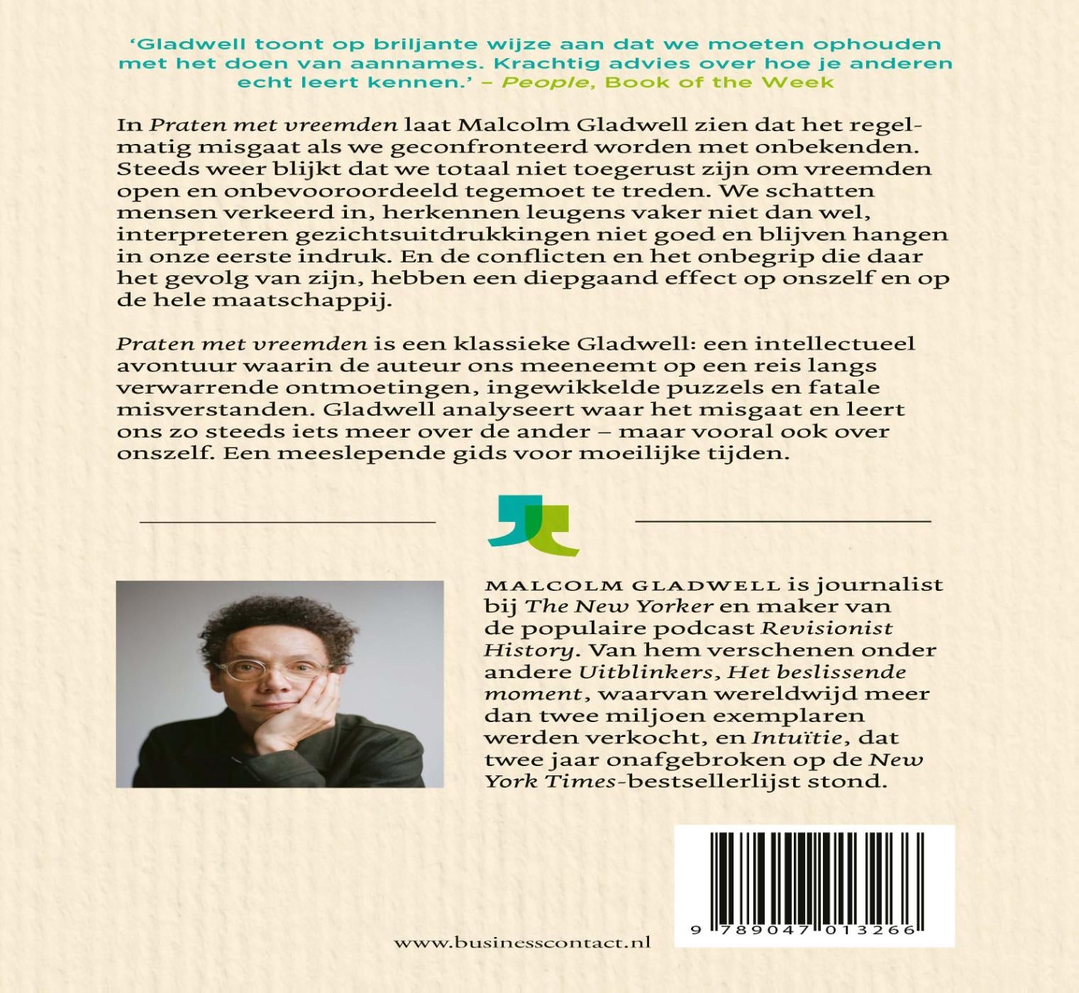 In ‘Praten met vreemden’ laat Malcolm Gladwell zien dat het regelmatig misgaat als we geconfronteerd worden met onbekenden. Steeds weer blijkt dat we totaal niet toegerust zijn om vreemden open en onbevooroordeeld tegemoet te treden. We schatten mensen verkeerd in, herkennen leugens vaker niet dan wel, interpreteren gezichtsuitdrukkingen niet goed en blijven hangen in onze eerste indruk. En de conflicten en het onbegrip die daar het gevolg van zijn, hebben een diepgaand effect op onszelf en op de hele maatschappij.