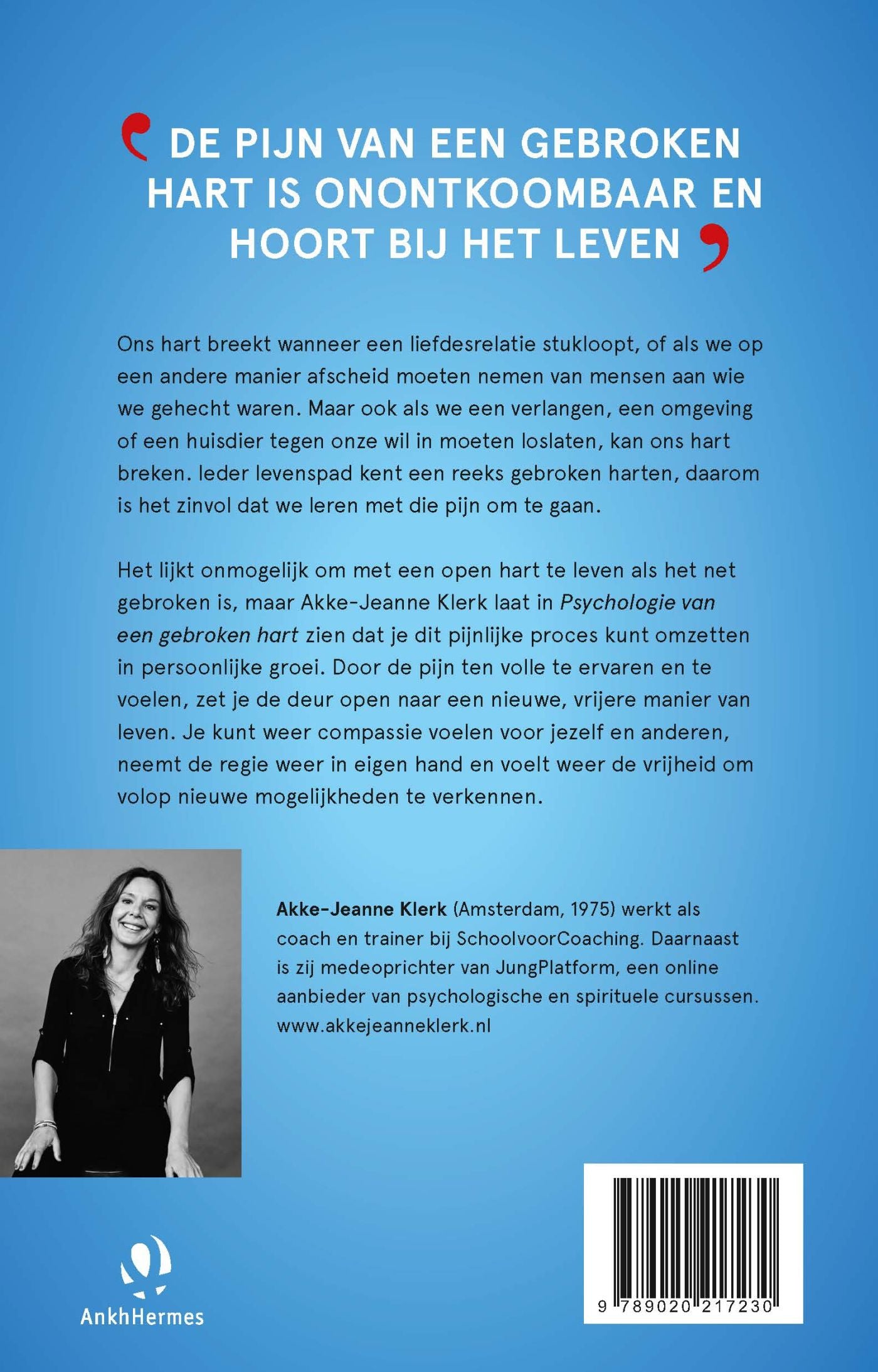 Akke-Jeanne Klerk schreef met Psychologie van een gebroken hart een prachtig, hoopvol boek over iets wat ons allemaal overkomt in ons leven: een gebroken hart. Na een verbroken liefde, maar ook na het verlies van een dierbare, een onvervulde levenswens of het verlies van een baan kunnen we ons hart breken. Een moeilijk en verdrietig proces, maar Akke-Jeanne laat ons zien dat het herstelproces begrijpen – het omzetten van een gebroken hart in persoonlijke groei – perspectief biedt. Ontwikkel compassie met jezelf en anderen, neem de regie in eigen hand en stippel je eigen koers uit. Zo open je de deur naar de volle ervaring van het bestaan en ben je vrij om nieuwe mogelijkheden te verkennen. Volg je hart opnieuw!