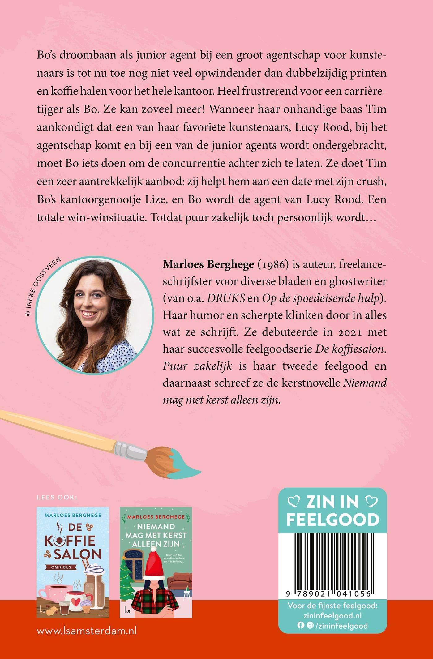 In Puur zakelijk, het nieuwe feelgoodboek van auteur Marloes Berghege (De koffiesalon-serie), is Bo’s droombaan als junior agent bij een groot agentschap voor kunstenaars tot nu toe nog niet veel opwindender dan dubbelzijdig printen en koffie halen voor het hele kantoor. Heel frustrerend voor een carrièretijger als Bo. Ze kan zoveel meer! Als haar onhandige baas Tim aankondigt dat een van haar favoriete kunstenaars, Lucy Rood, bij het agentschap komt en bij een van de junior agents wordt ondergebracht, moet ze iets doen om de concurrentie achter zich te laten. Ze doet Tim een zeer aantrekkelijk aanbod: zij helpt hem aan een date met zijn crush, Bo’s kantoorgenootje Lize, en zij wordt de agent van Lucy Rood. Een totale win-winsituatie. Totdat puur zakelijk toch persoonlijk wordt…