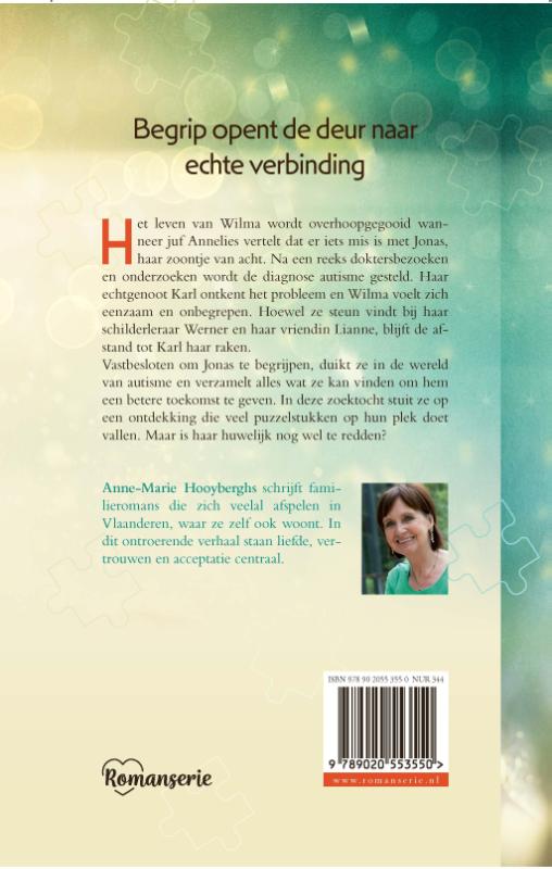 In 'Puzzelstukken' van Anne-Marie Hooyberghs staat Wilmas leven op zijn kop wanneer haar zoontje Jonas de diagnose autisme krijgt. Haar echtgenoot Karl ontkent het probleem en Wilma voelt zich hierdoor eenzaam en onbegrepen. Ze vindt steun bij haar schilderleraar Werner en bij vriendin Lianne, maar de afstand tot Karl blijft haar raken. Vastbesloten om Jonas te begrijpen, duikt ze in alles wat ze over autisme kan vinden. In deze zoektocht stuit ze op een ontdekking die veel puzzelstukken op hun plek doet vallen. Maar valt haar huwelijk nog wel te redden?
