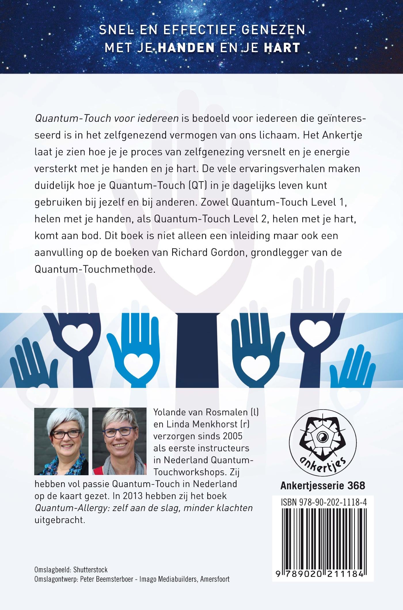 Quantum-Touch voor iedereen van Linda Menkhorst en Yolande van Rosmalen brengt helen met je hart en handen binnen bereik van iedereen. Dit Ankertje is bedoeld voor leken, ouders, therapeuten, leerkrachten en andere professionele hulpverleners. Het behandelt zowel het genezen van jezelf als het helpen van anderen bij hun zelfgenezing en laat zien hoe je Quantum-Touch (QT) in je dagelijks leven in kunt passen. Het inspireert om jezelf op een eenvoudige en effectieve manier te helpen om optimaal en gezond te leven.
