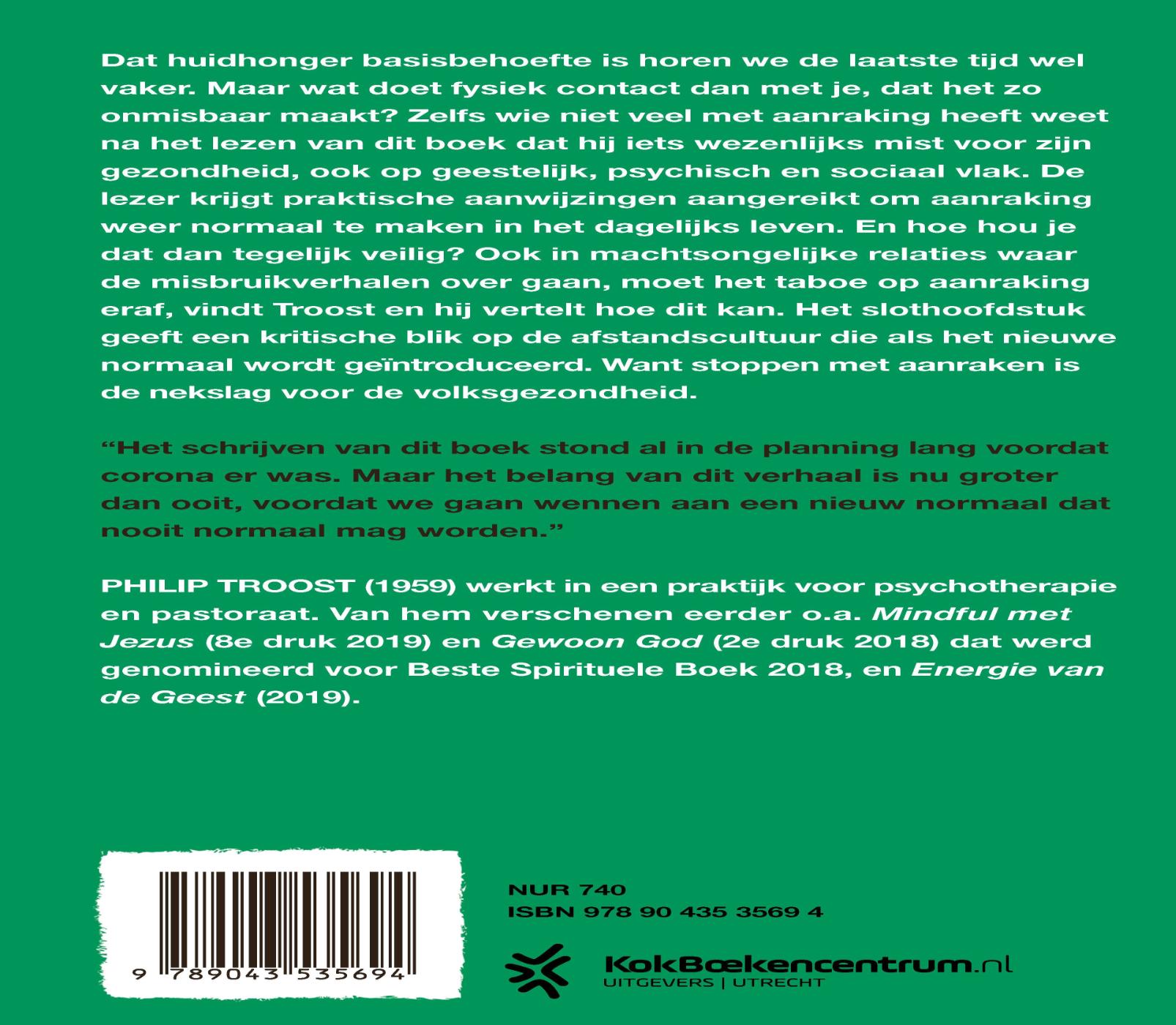 Dat huidhonger basisbehoefte is horen we de laatste tijd wel vaker. Maar wat doet fysiek contact dan met je, dat het zo onmisbaar maakt? Zelfs wie niet veel met aanraking heeft weet na het lezen van dit boek dat hij iets wezenlijks mist voor zijn gezondheid, ook op geestelijk, psychisch en sociaal vlak. De lezer krijgt praktische aanwijzingen aangereikt om aanraking weer normaal te maken in het dagelijks leven. En hoe hou je dat dan tegelijk veilig? Ook in machtsongelijke relaties waar de misbruikverhalen over gaan, moet het taboe op aanraking eraf, en Troost vertelt hoe dit kan. Het slothoofdstuk geeft een kritische blik op de afstandscultuur die als het nieuwe normaal wordt geïntroduceerd. Want stoppen met aanraken is de nekslag voor de volksgezondheid. ‘Het schrijven van dit boek stond al in de planning lang voordat corona er was. Maar het belang van dit verhaal is nu groter dan ooit, voordat we gaan wennen aan een nieuw normaal dat nooit normaal mag worden.’