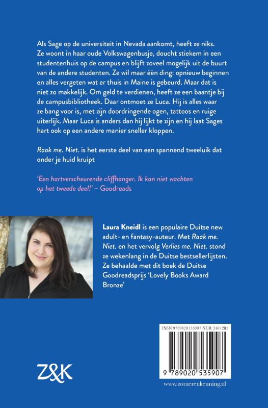 Laura Kneidl schreef met 'Raak me. Niet.' een meeslepend eerste deel van een new adult-serie, dat eindigt met een grote cliffhanger. Het verhaal van Sage en Luca gaat verder in het tweede deel, 'Verlies me. Niet.'.