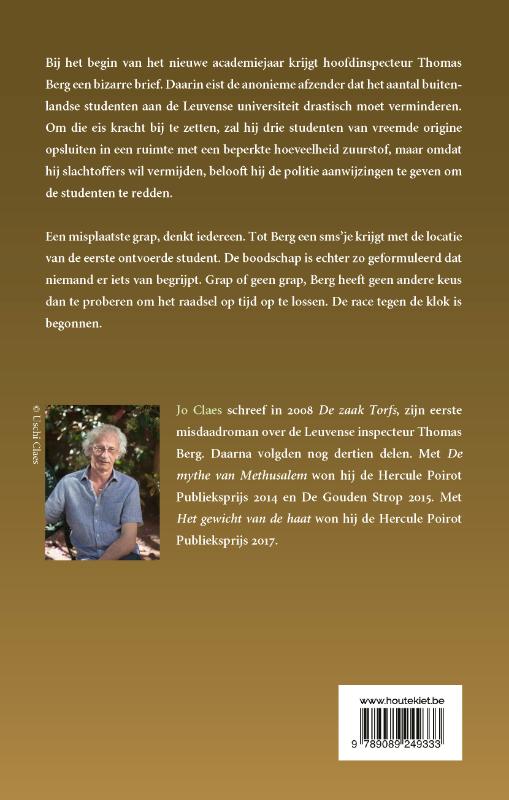 Bij het begin van het nieuwe academiejaar krijgt hoofdinspecteur Thomas Berg een bizarre brief. Daarin eist de anonieme afzender dat het aantal buitenlandse studenten aan de Leuvense universiteit drastisch moet verminderen. Om die eis kracht bij te zetten, zal hij drie studenten van vreemde origine opsluiten in een ruimte met een beperkte hoeveelheid zuurstof, maar omdat hij slachtoffers wil vermijden, belooft hij de politie aanwijzingen te geven om de studenten te redden.
