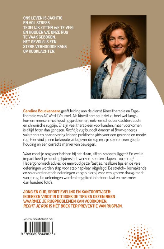 Caroline Bouckenaere geeft leiding aan de dienst Kinesitherapie en Ergotherapie van AZ West (Veurne). Als kinesitherapeut ziet zij heel wat langskomen: mensen met houdingsproblemen, nek- en schouderklachten, acute en chronische rugpijn. Er zijn veel therapieën voorhanden, maar voorkomen is altijd beter dan genezen. Recht je rug bundelt daarom al Bouckenaeres vakkennis en haar ervaring tot een praktische gids voor een gezonde en mooie rug. Hier vind je een beknopte uitleg over de rug en zijn spieren, een goede houding en een correcte manier van bewegen. Waar moet je oog voor hebben bij het staan, zitten, stappen, liggen? En welke impact heeft je houding tijdens het werken, sporten, slapen… op je rug?