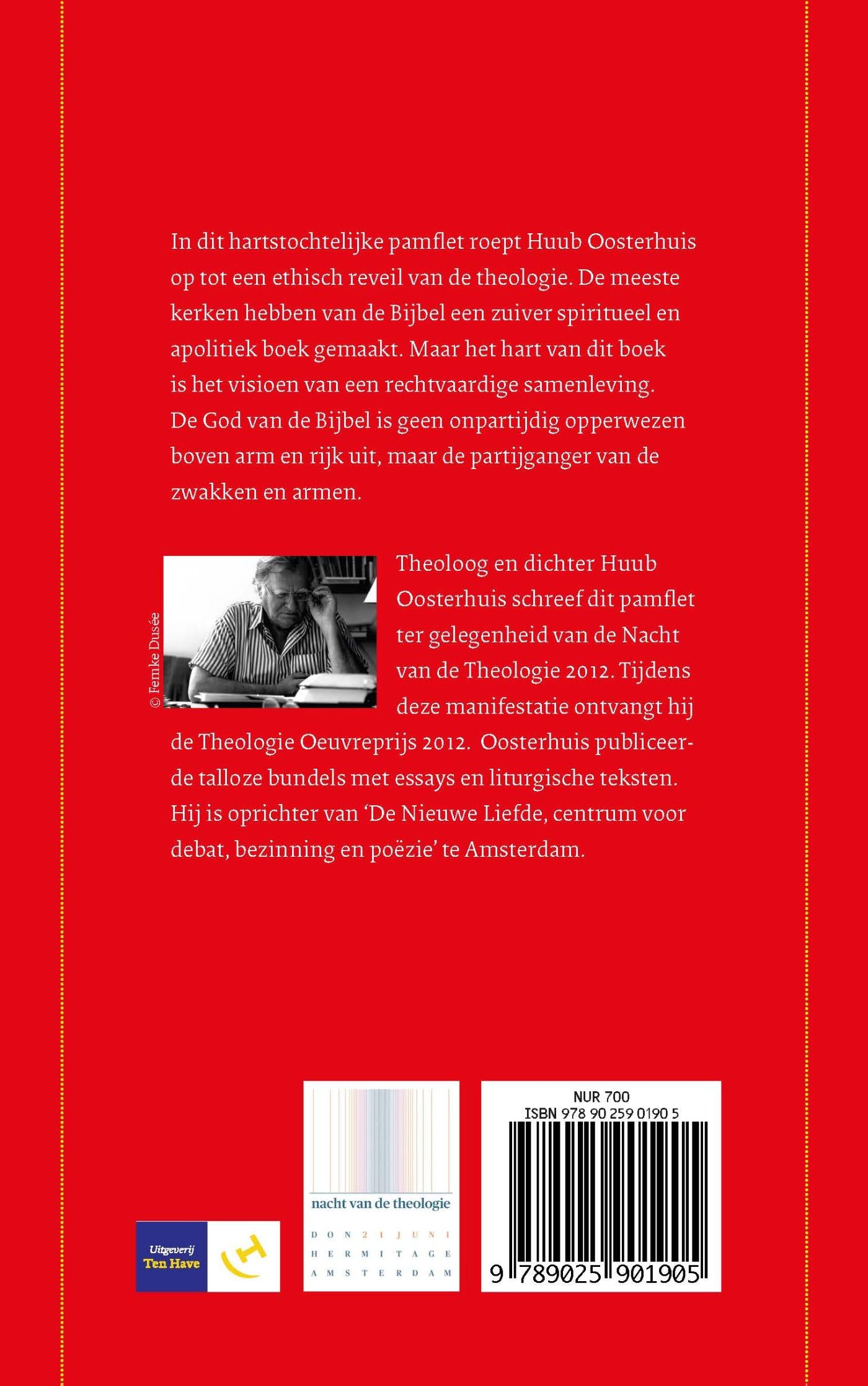 In dit hartstochtelijke pamflet roept Huub Oosterhuis op tot een ethisch reveil van de theologie. De meeste kerken hebben van de Bijbel een zuiver spiritueel en a-politiek boek gemaakt. Maar het hart van dit boek is het visioen van een rechtvaardige samenleving. De God van de Bijbel is geen onpartijdig opperwezen boven arm en rijk uit, maar de partijganger van de zwakken en armen.