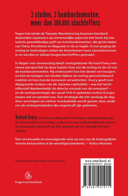 In ‘Regen van verwoesting’ contextualiseert Richard Overy de verwoestende bombardementen op Japan in 1945, waarbij meer dan 300.000 Japanse slachtoffers vielen. Het bombardement op Tokio in maart verbrandde bijna heel de stad, de atoombom op Hiroshima in augustus doodde zo’n 119.000 burgers en na een tweede nucleaire aanval op Nagasaki capituleerde Japan.