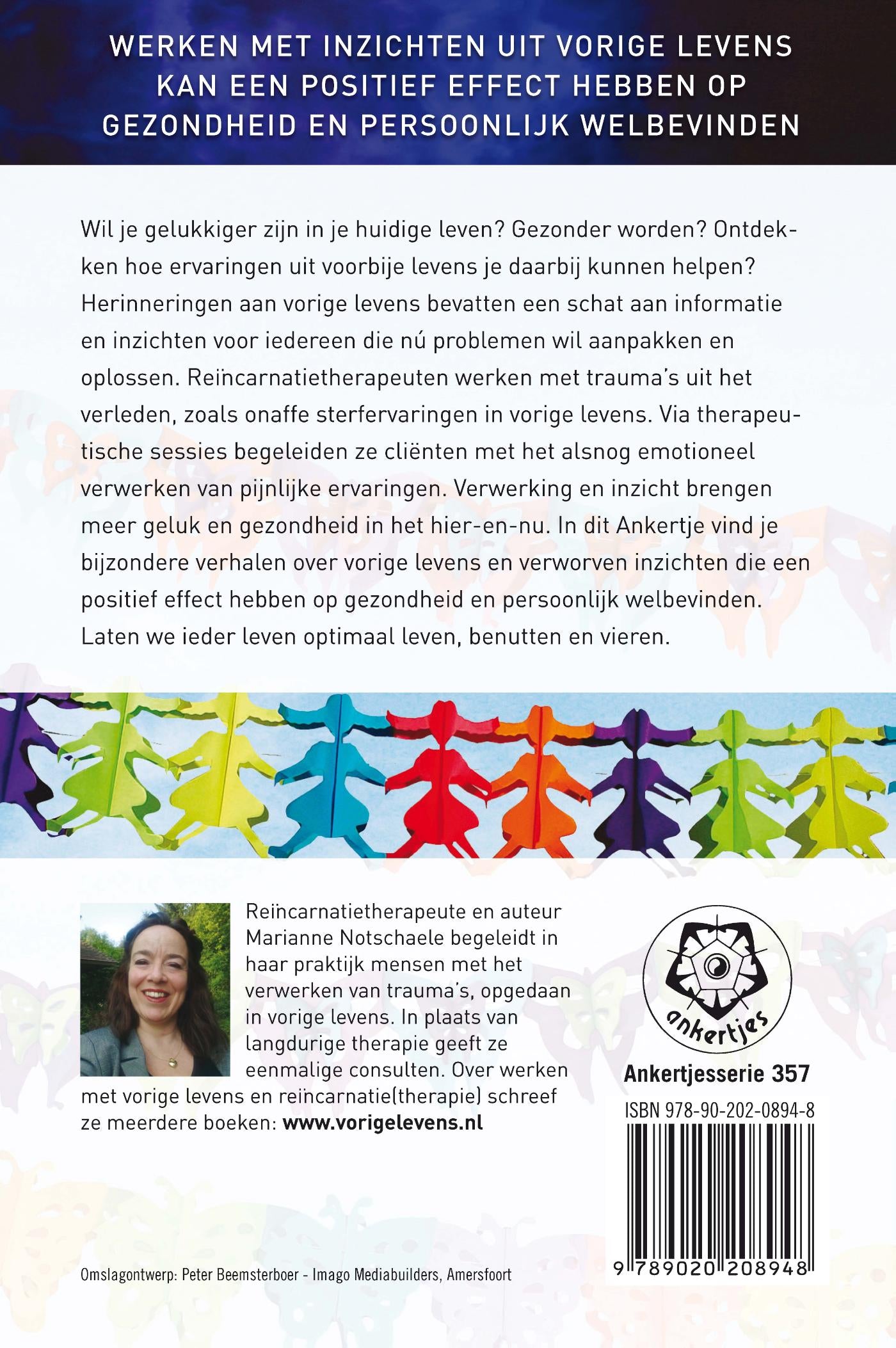 Wil je gelukkiger zijn in je huidige leven? Gezonder worden? Ontdekken hoe ervaringen uit voorbije levens je daarbij kunnen helpen? Herinneringen aan vorige levens bevatten een schat aan informatie en inzichten voor iedereen die nú problemen wil aanpakken en oplossen. Reïncarnatietherapeuten werken met trauma s uit het verleden, zoals onaffe sterfervaringen in vorige levens. Via therapeutische sessies begeleiden ze cliënten met het alsnog emotioneel verwerken van pijnlijke ervaringen. Verwerking en inzicht brengen meer geluk en gezondheid in het hier en nu. In dit Ankertje vind je bijzondere verhalen over vorige levens en verworven inzichten die een positief effect hebben op gezondheid en persoonlijk welbevinden. Laten we ieder leven optimaal leven, benutten en vieren.