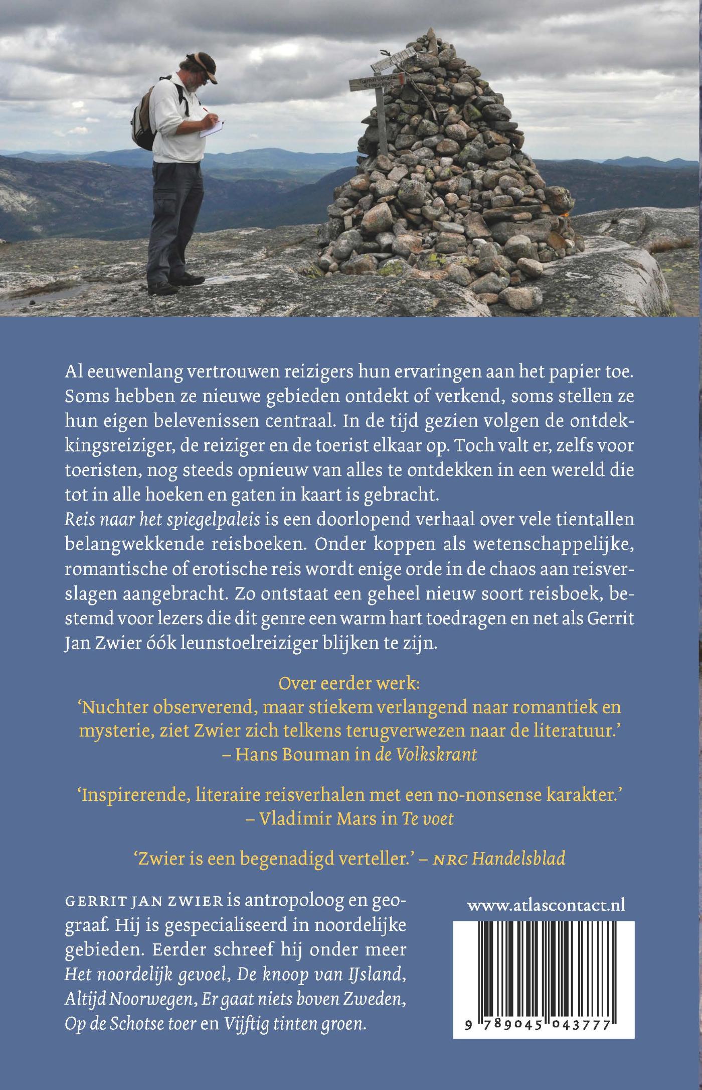 Het nieuwste boek van Gerrit Jan Zwier is ‘Reis naar het spiegelpaleis’. Al eeuwenlang vertrouwen reizigers hun ervaringen aan het papier toe. Soms hebben ze nieuwe gebieden ontdekt of verkend, soms stellen ze hun eigen belevenissen centraal. In de tijd gezien volgen de ontdekkingsreiziger, de reiziger en de toerist elkaar op. Toch valt er, zelfs voor toeristen, nog steeds opnieuw van alles te ontdekken in een wereld die tot in alle hoeken en gaten in kaart is gebracht. ‘Reis naar het spiegelpaleis’ is een doorlopend verhaal over vele tien tallen belangwekkende reisboeken. Onder koppen als wetenschappelijke, romantische of erotische reis wordt enige orde in de chaos aan reisverslagen aangebracht. Zo ontstaat een geheel nieuw soort reisboek, bestemd voor lezers die dit genre een warm hart toedragen en net als Zwier óók leunstoelreiziger blijken te zijn.