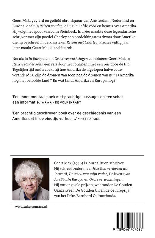 Net als in In Europa en in Grote verwachtingen combineert Geert Mak in Reizen zonder John een reis door het continent met een reis door de tijd. Tegelijkertijd onderzoekt hij hoe Amerika de afgelopen halve eeuw veranderd is. Zijn de dromen van toen nog de dromen van nu? Is Amerika nog ‘het beloofde land’? En wat bindt Amerika en Europa nog?