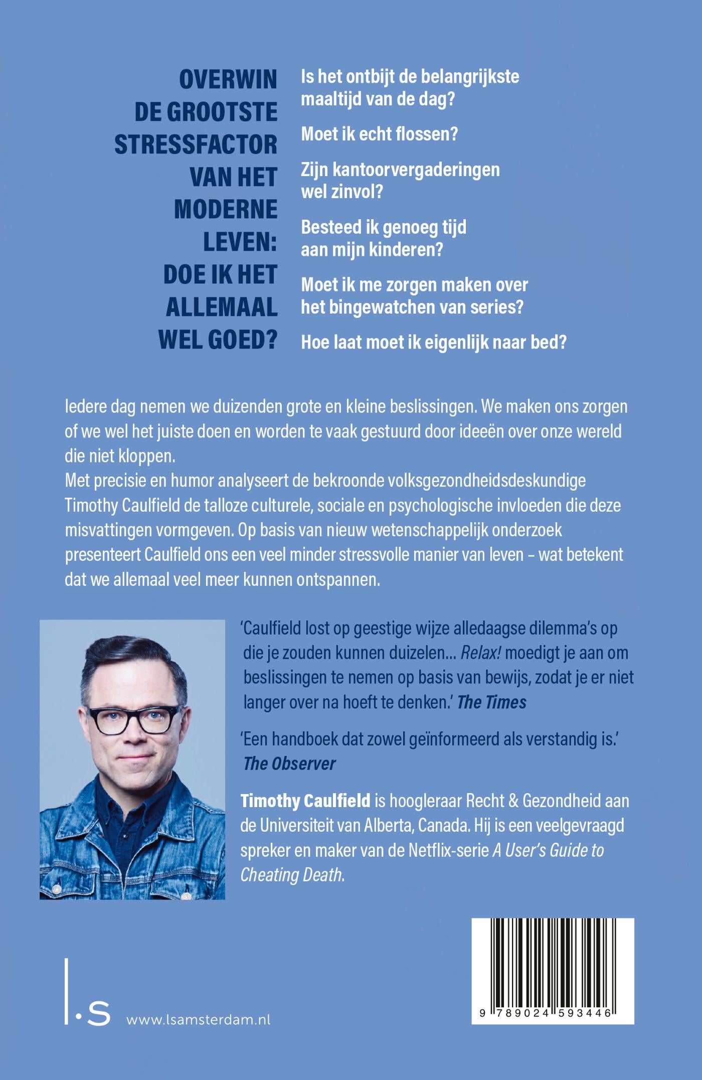 Of hij nu mobiel telefoongebruik, woon-werkverkeer op de fiets of de consumptie van rauwe melk bestudeert: Caulfield toont dat veel dingen die volgens ons gezonder, veiliger of gewoon beter zijn, dat simpelweg níét zijn. Op basis van nieuw wetenschappelijk onderzoek toont de auteur ons een minder stressvolle manier van leven – wat betekent dat we allemaal veel meer kunnen ontspannen.
