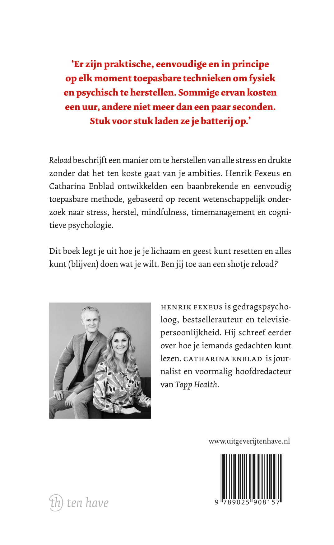 Is er een manier waarop je kan herstellen van alle stress en drukte zonder dat het ten koste gaat van jouw ambities? Henrik Fexeus en Catharina Enblad ontwikkelden de baanbrekende methode reload. Hun boek presenteert een reeks technieken gebaseerd op recent wetenschappelijk onderzoek naar stress, herstel, mindfulness, time management en cognitieve psychologie. Ben jij toe aan een shotje reload?