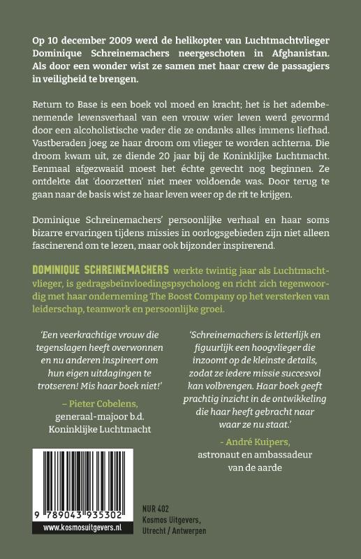 'Return to Base' is het adembenemende levensverhaal van Dominique Schreinemachers, een vrouw die haar droom om militair helikopterpiloot te worden met vastberadenheid waarmaakte. Als meisje uit een kunstenaarsfamilie in Zuid-Limburg wist ze haar weg te vinden naar de luchtmacht, waar ze twintig jaar diende en letterlijk voor haar leven vocht tijdens missies in oorlogsgebieden. Op 10 december 2009 werd haar helikopter neergeschoten in Afghanistan. Als door een wonder wist ze samen met haar crew de passagiers in veiligheid te brengen.