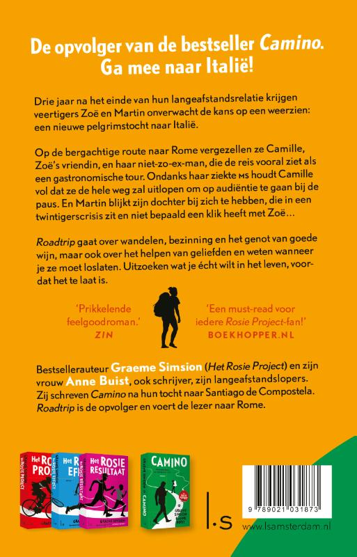 In Roadtrip van Graeme Simsion (Het Rosie Project) en Anne Buist volgen we veertigers Zoë en Martin. Drie jaar geleden liepen ze samen de Camino en op zoek naar zichzelf vonden ze elkaar. Toen hield hun relatie geen stand, nu krijgen ze een tweede kans als ze Zoë’s vriendin Camille vergezellen op weg naar Rome. Camille heeft MS en wil koste wat kost de lange voettocht volbrengen.