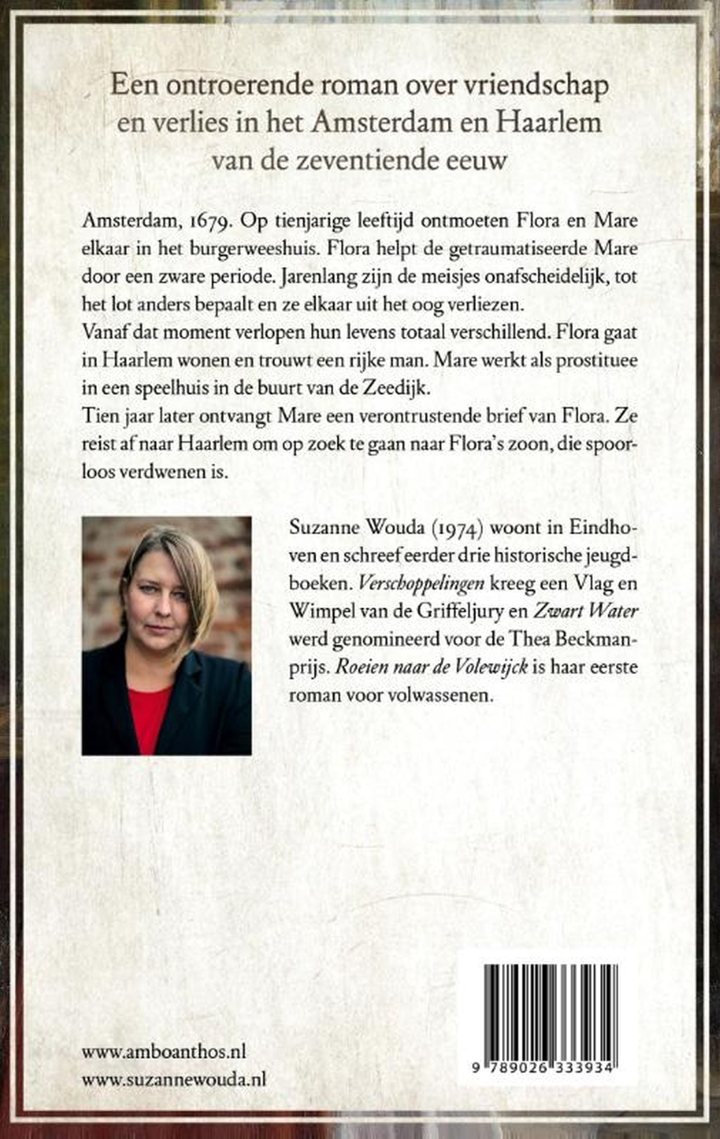 Suzanne Wouda schreef met Roeien naar de Volewijck een beeldende historische roman over Amsterdam en Haarlem in de zeventiende eeuw, het Burgerweeshuis en het Dolhuys. Flora en Mare groeien samen op in het Burgerweeshuis. Na die tijd verliezen ze elkaar uit het oog. Flora trouwt een rijke koopman, Mare belandt in de prostitutie. Tien jaar later ontvangt Mare een verontrustende brief van Flora. Ze reist af naar Haarlem om op zoek te gaan naar Flora’s zoon, die spoorloos verdwenen is. Suzanne Wouda schreef eerder drie historische jeugdromans. Ze werd genomineerd voor de Thea Beckmanprijs en kreeg een Vlag en Wimpel van de Griffeljury. Net als Simone van der Vlugt besloot ze om ook historische romans voor volwassenen te gaan schrijven.