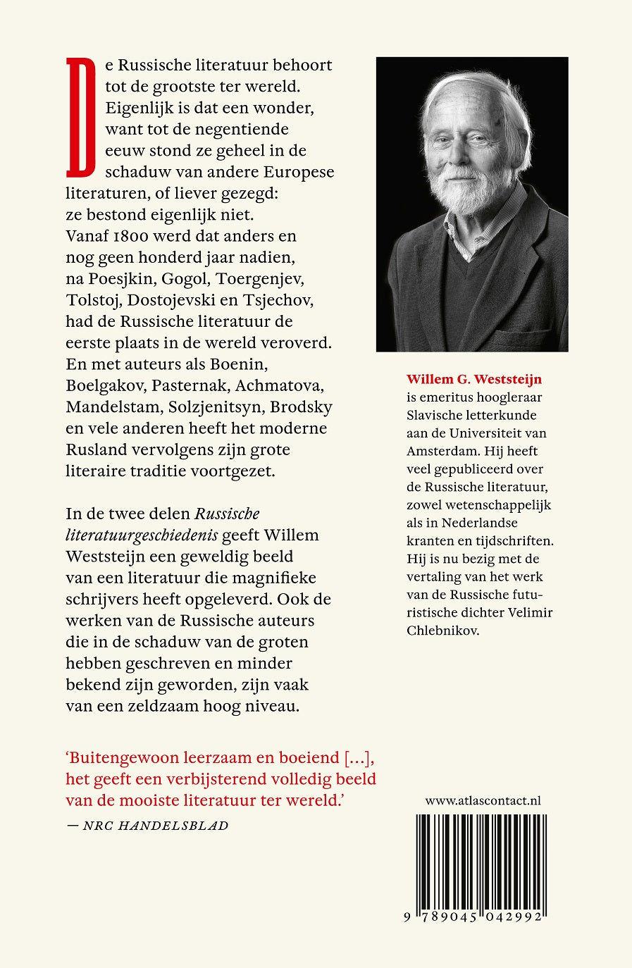 In deze heruitgave van Willem Weststeijns ‘Russische literatuurgeschiedenis’ wordt de opkomst van ’s werelds meest vooraanstaande literaire gebieden uitvoerig besproken. De Russische literatuur behoort tot de grootste ter wereld. Eigenlijk is dat een wonder, want tot de negentiende eeuw stond ze geheel in de schaduw van andere Europese literaturen, of liever gezegd: ze bestond eigenlijk niet. Vanaf 1800 werd dat anders en nog geen honderd jaar nadien, na Poesjkin, Gogol, Toergenjev, Tolstoj, Dostojevski en Tsjechov, had de Russische literatuur de eerste plaats in de wereld veroverd. En met auteurs als Boenin, Boelgakov, Pasternak, Achmatova, Mandelstam, Solzjenitsyn, Brodsky en vele anderen heeft het moderne Rusland vervolgens zijn grote literaire traditie voortgezet. In de twee delen Russische literatuurgeschiedenis geeft Willem Weststeijn een geweldig beeld van een literatuur die magnifieke schrijvers heeft opgeleverd. Ook de werken van de Russische auteurs die in de schaduw van de groten hebben geschreven en minder bekend zijn geworden, zijn vaak van een zeldzaam hoog niveau.